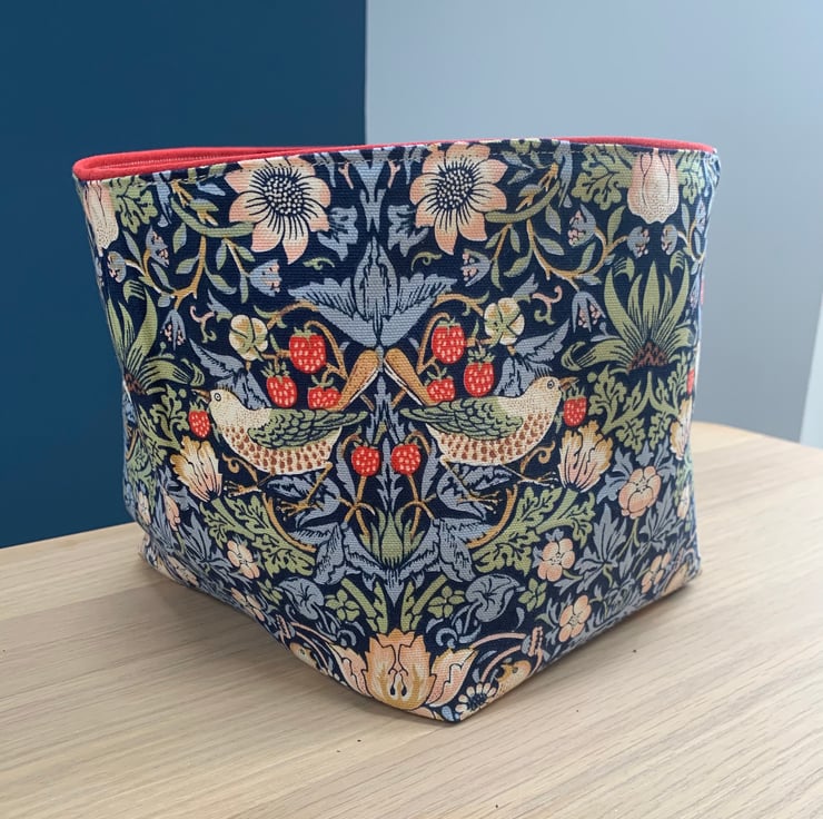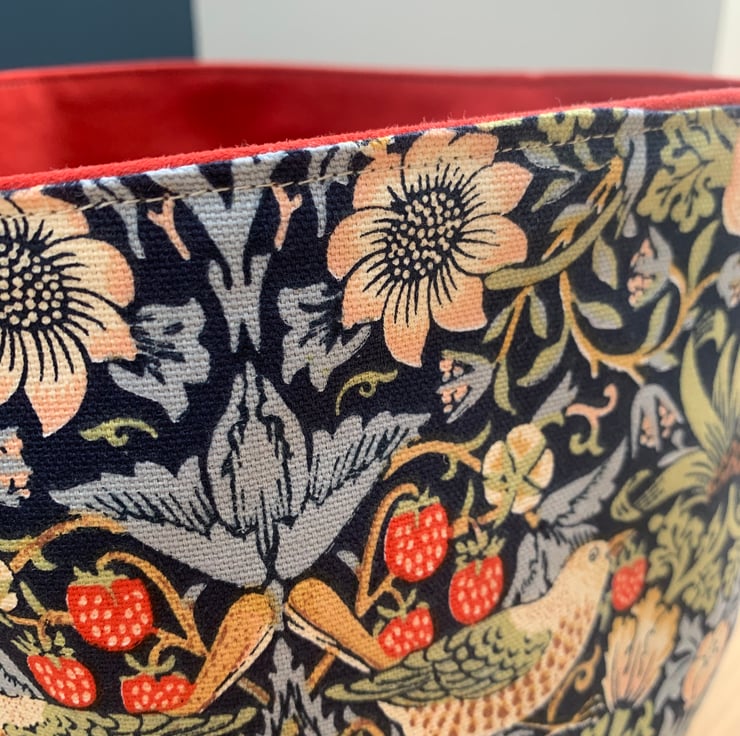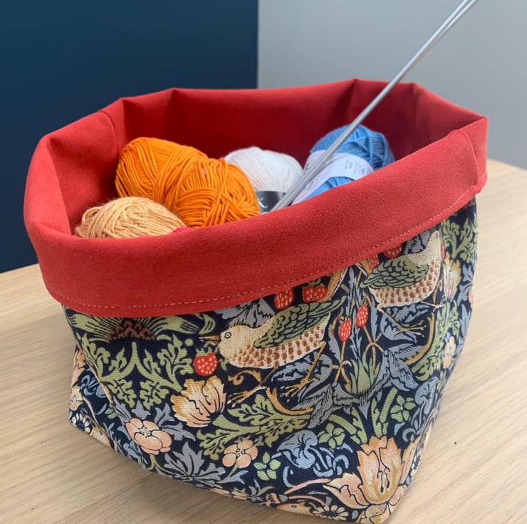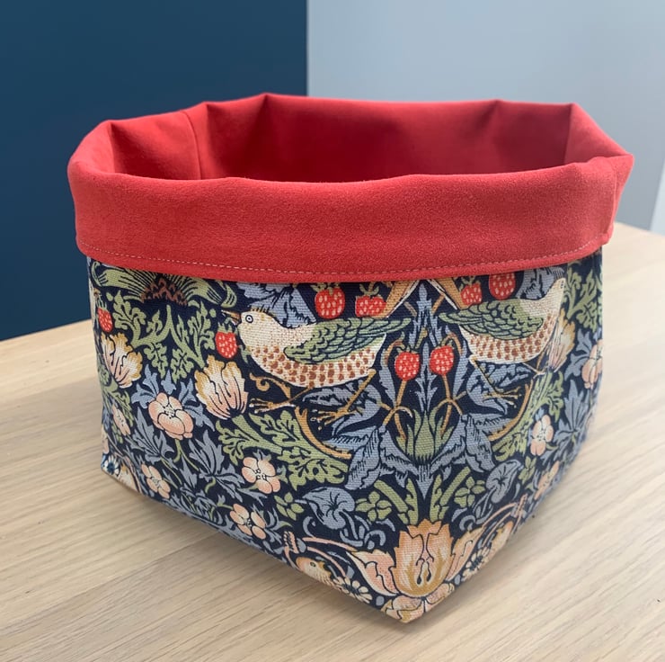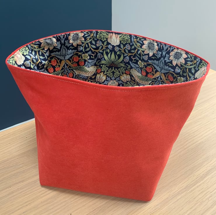 Reversible fabric basket made from soft red faux suede and William Morris Strawberry Thief cotton. Can be used with a turn-down to make the most of the contrasting fabrics.