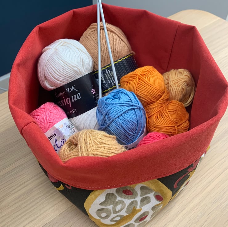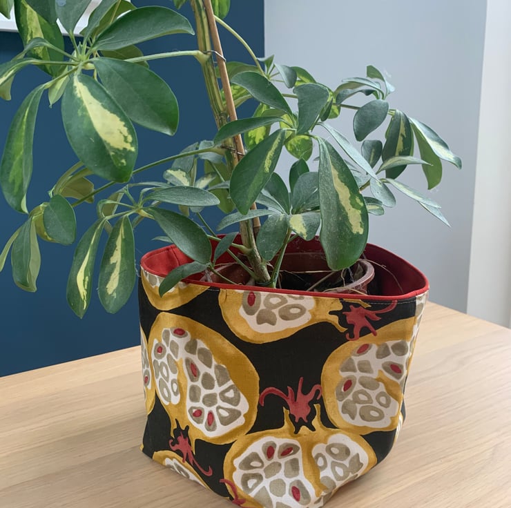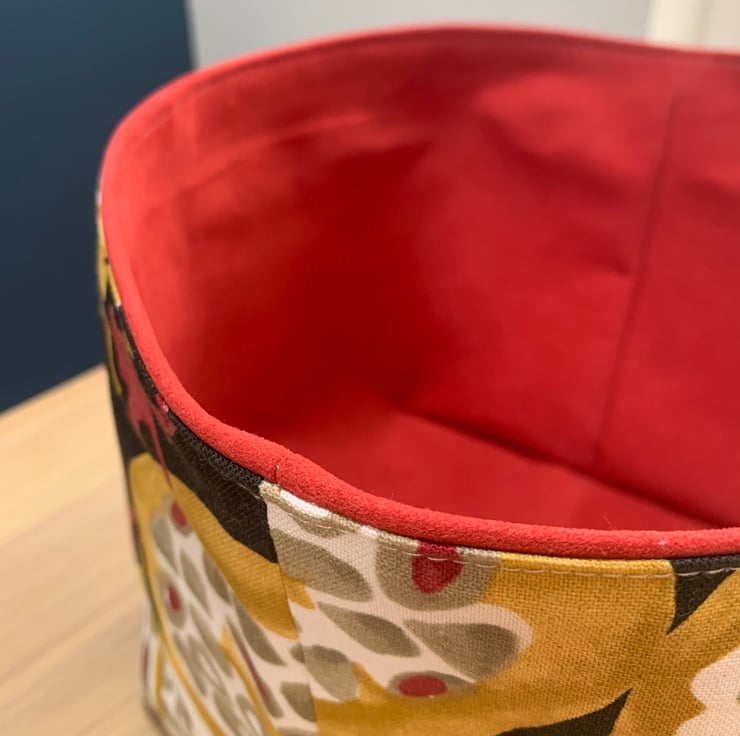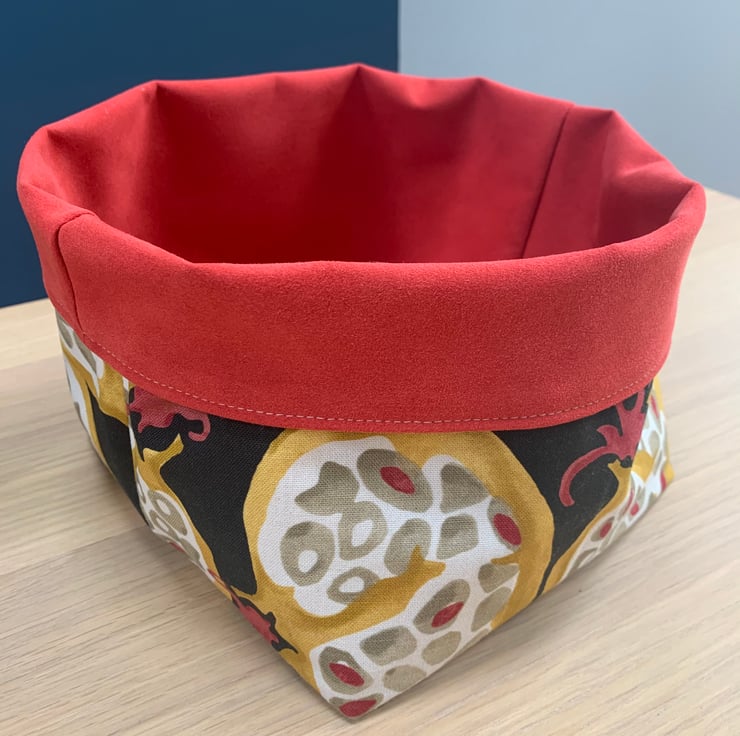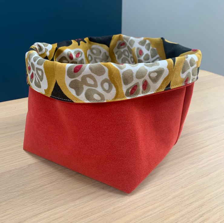 Reversible fabric basket made from soft red faux suede and Emma Bridgewater Pomegranate cotton by Sanderson. Can be used with a turn-down to make the most of the contrasting fabrics.