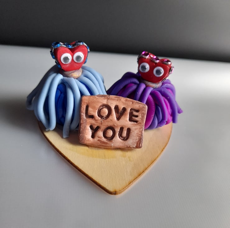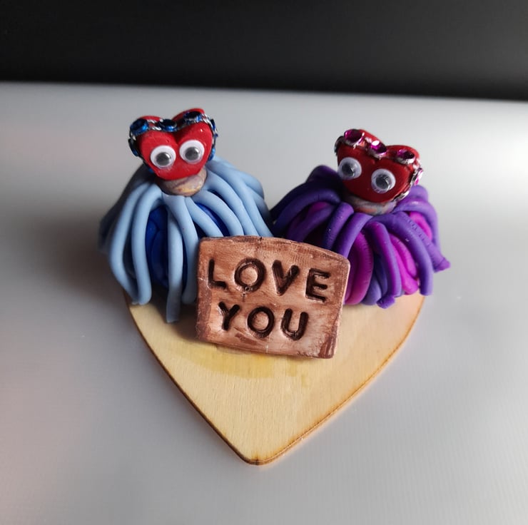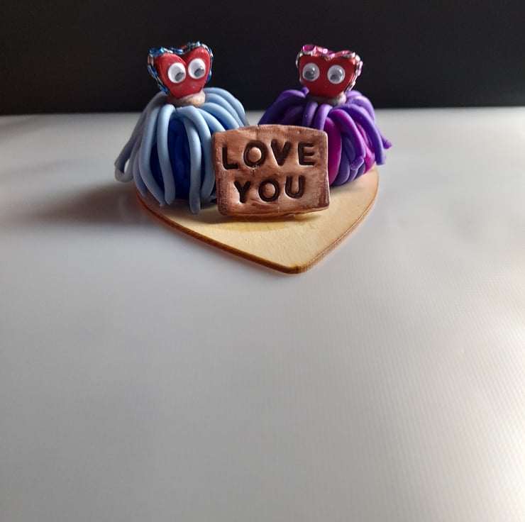 Made from polymer clay these little love bugs are looking for a new home. They are sitting on a wooden heart base.
