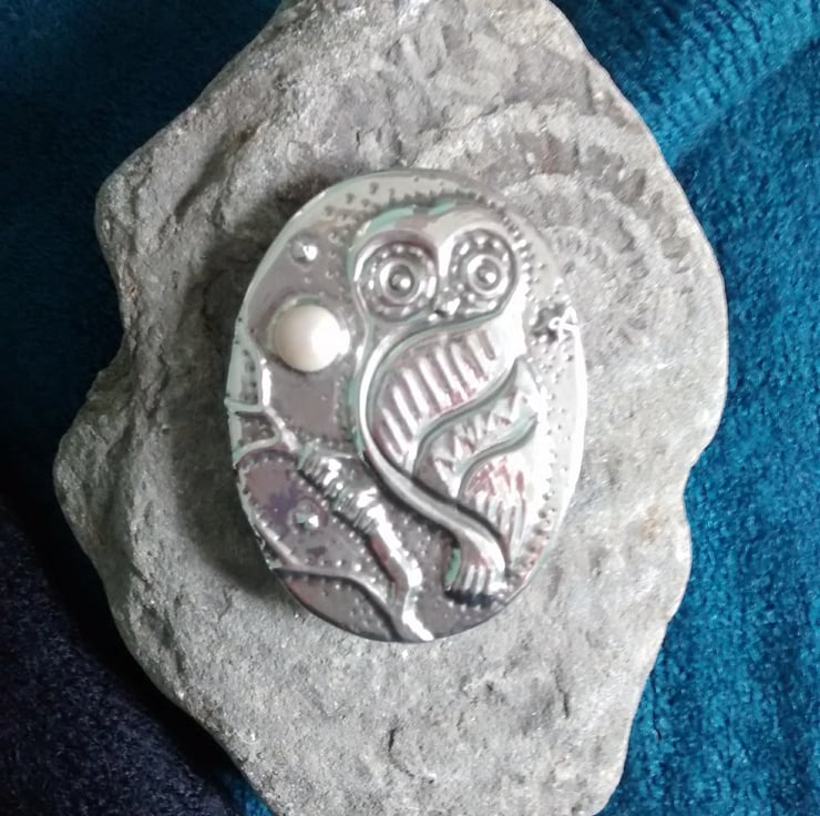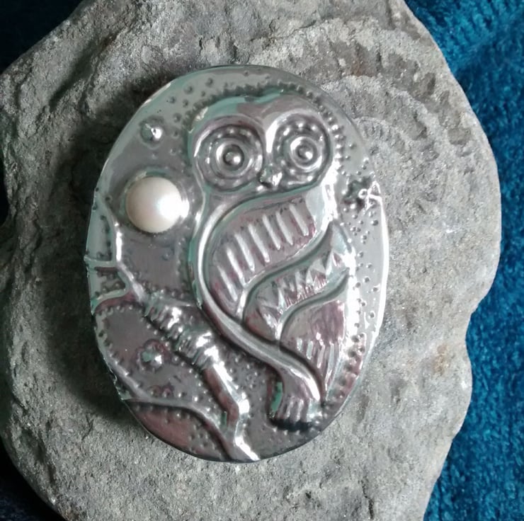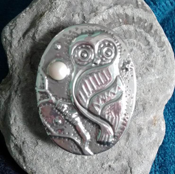Owl brooch handcrafted in pewter with moon of Swarovski pearl. This quirky owl brooch has been handmade in the UK from lead-free sheet pewter. Light in weight for versatility of use, an owl brooch could be worn to add extra interest to a coat, scarf, hat or bag.