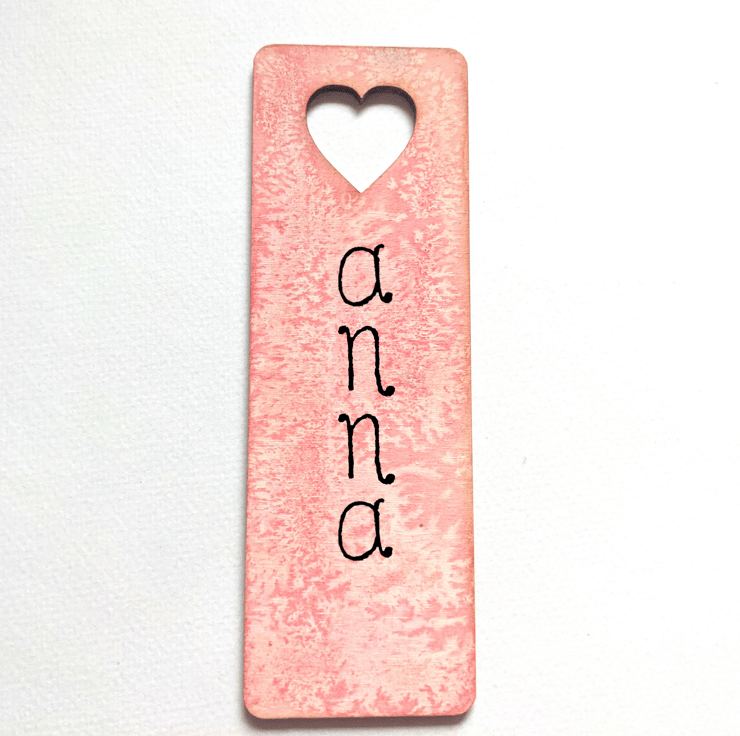 The bookmark measures 5cm x 15cm and is 3mm thick. At the top centre of the bookmark is a cutout of a heart also.