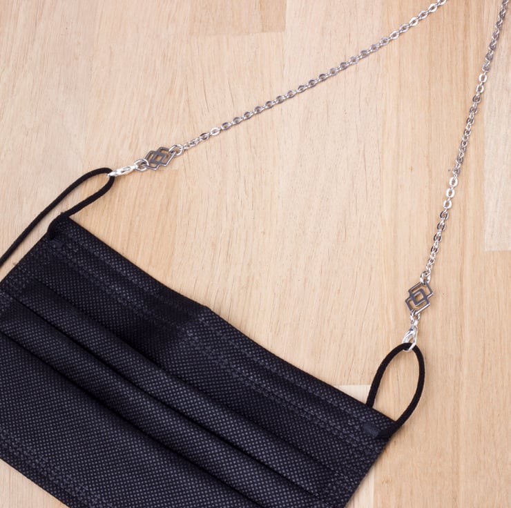 This chain features a stainless steel interlinking squares design in a silver-tone oval link chain, finished with lobster clasps to hold your mask. Approximately 22 inches long.
