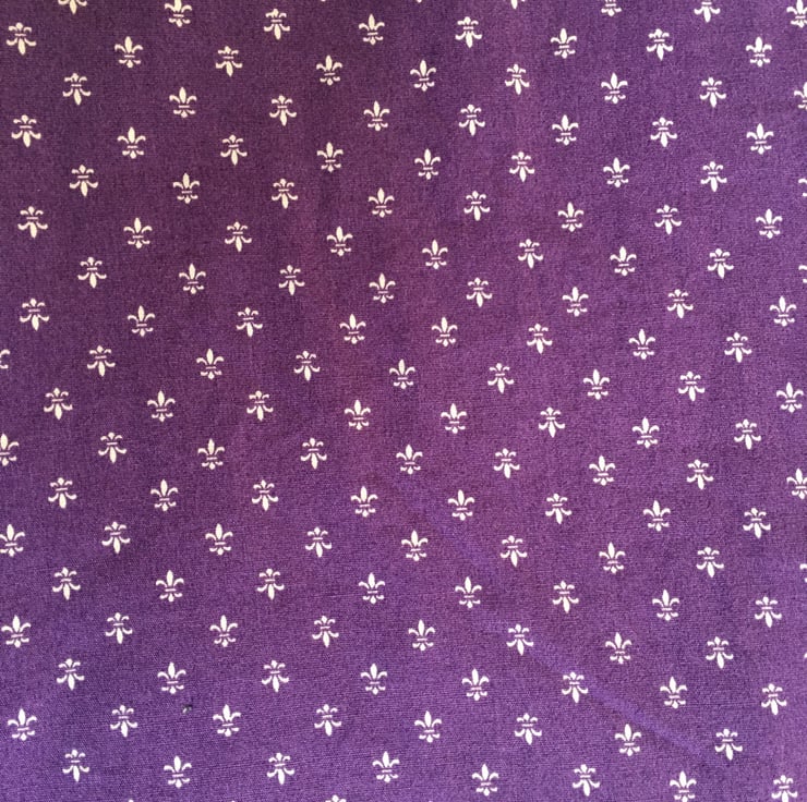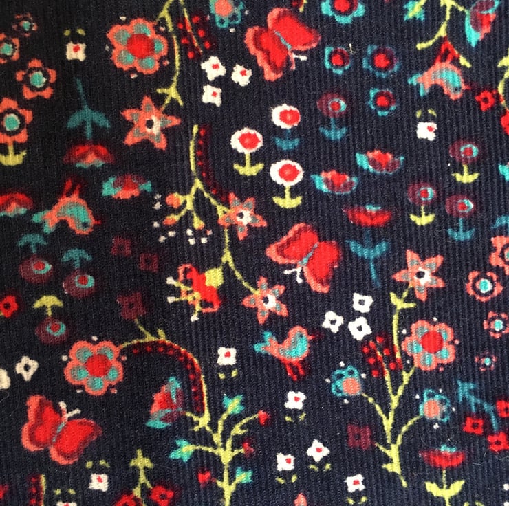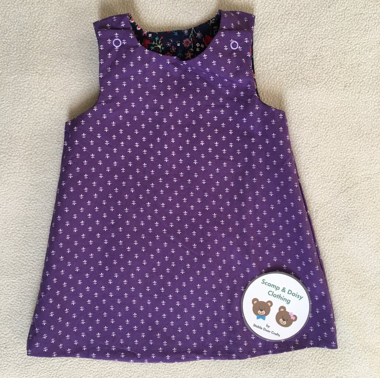 Pinafore dress needlecord floral fabric on one side and purple fleur d’lys cotton print on the reverse.
