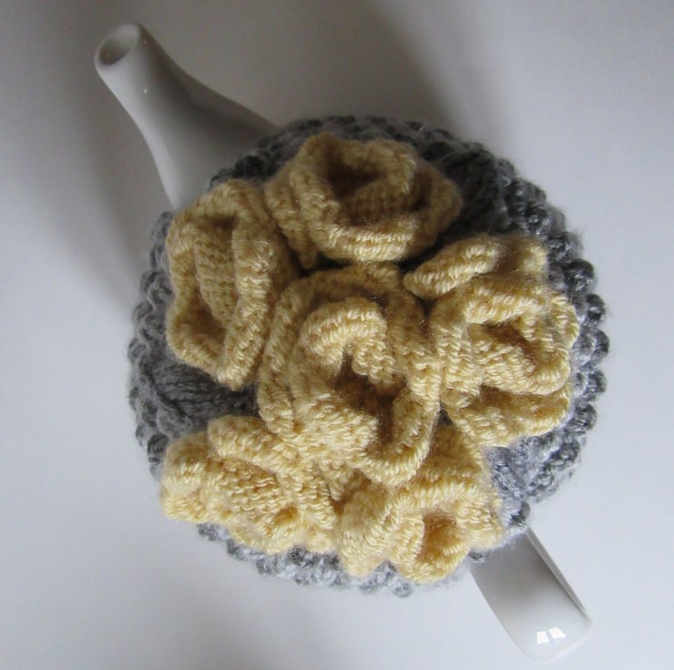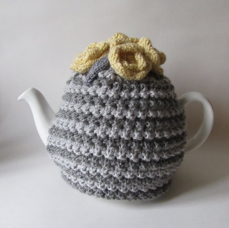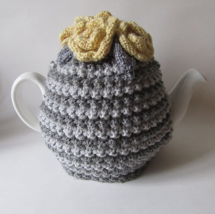 A beautifully hand knitted grey stripy tea cosie with sunshine yellow coloured roses on top. The body of the tea cosie is knitted in a nobbly stitch lending a 3D effect for extra thickness. It is knitted in silver grey and graphite grey thin stripes. The cosie fits snugly around the pot, yet with enough ease for a swift removal when a top up is required. The tea pot handle peeps through the side opening so it dosnt get too hot to handle. On top there are six rose like flowers using sunshine yellow coloured yarn and three graphite grey leaves. It fits a standard 4 cup tea pot. A contemporary colourway for a more modern home.