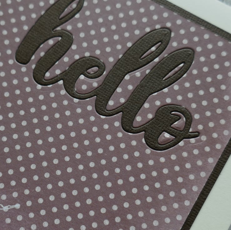A piece of brown floral paper with a spot background has been layered onto brown textured card. 'hello' has been die cut from brown textured card and inlaid into the top corner.