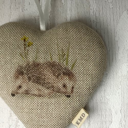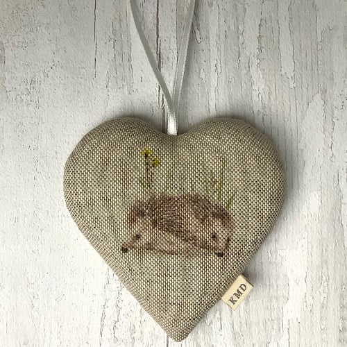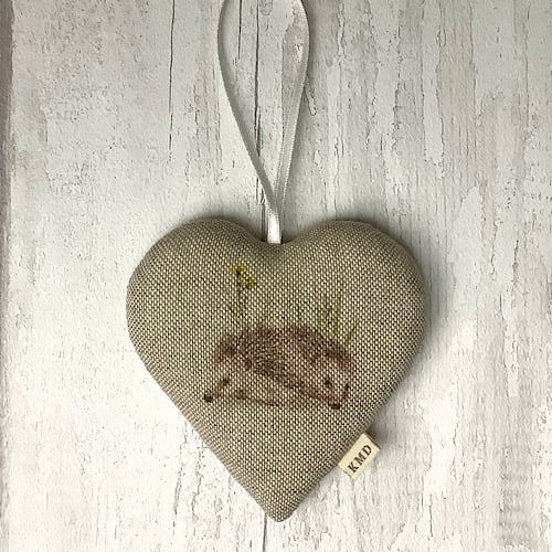 Hanging heart in a beautiful hedgehog print. Stuffed. 9cm wide by 17cm high to top of ribbon. This item is handmade and finished to a high standard. Please note that due to the pattern repeat in fabric some hearts may differ slightly to the picture shown.