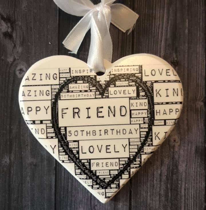 Send this personalised 50th birthday hanging heart gift to your friend for her 50th birthday.