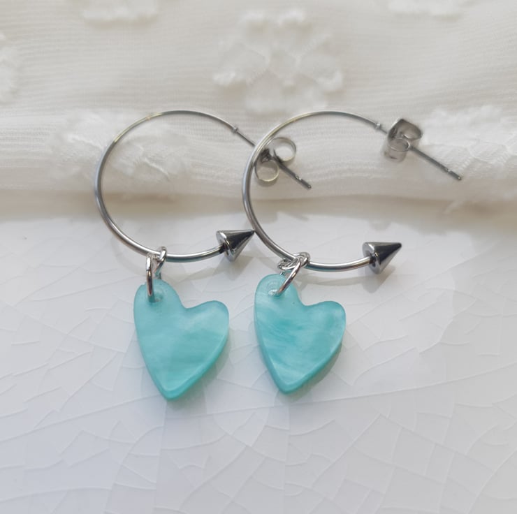 Gorgeous turquoise resin hearts with a swirly texture hang from beautiful stainless steel silver plated half hoops - I love the detailing on these hoops as they look lust like cupids arrows!