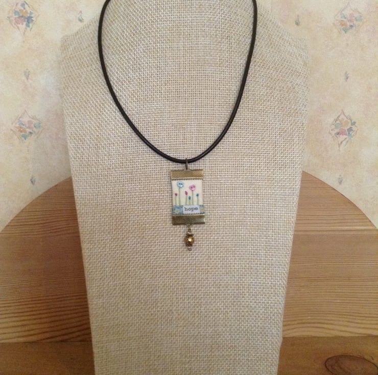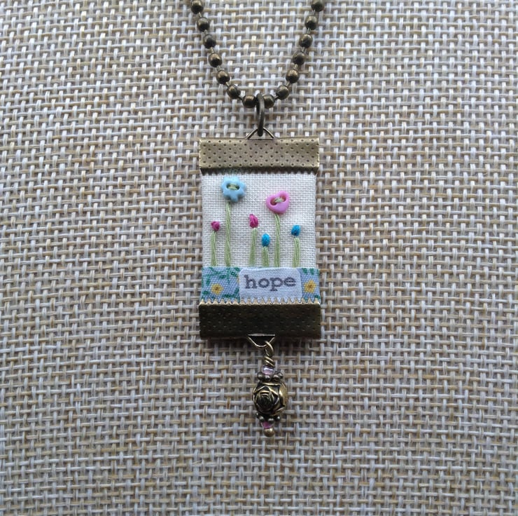 I have sewn tiny buttons and "flowers" onto a linen background. A small piece of patterned fabric is at the bottom with a tiny printed "hope" label on top. The label is firmly fixed at the lower end under the ribbon crimp. I have made a bronze and glass seed bead dangle and hung it from the lower ribbon crimp.