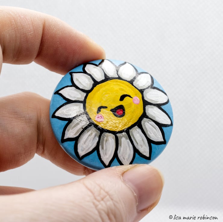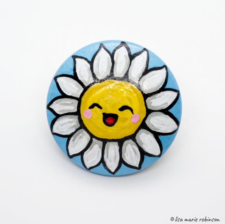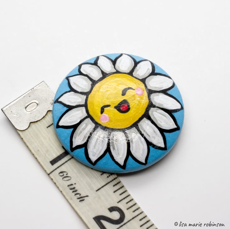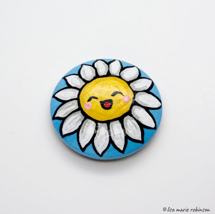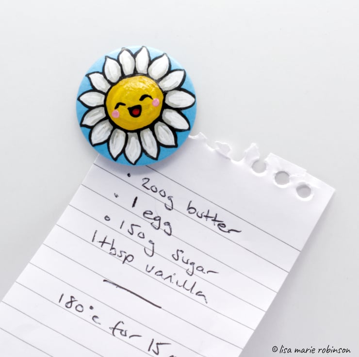Super cute hand painted fridge magnet featuring a white daisy flower with a happy smile!