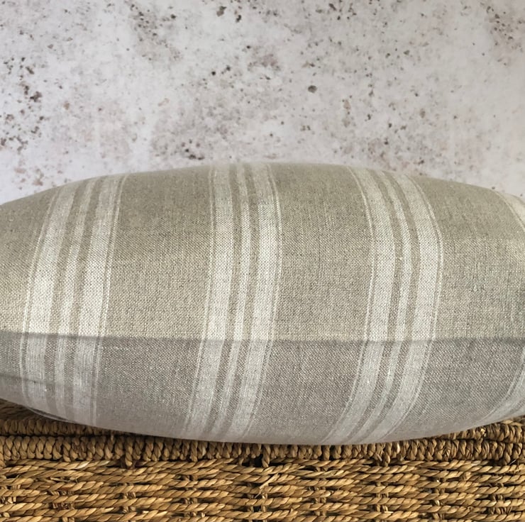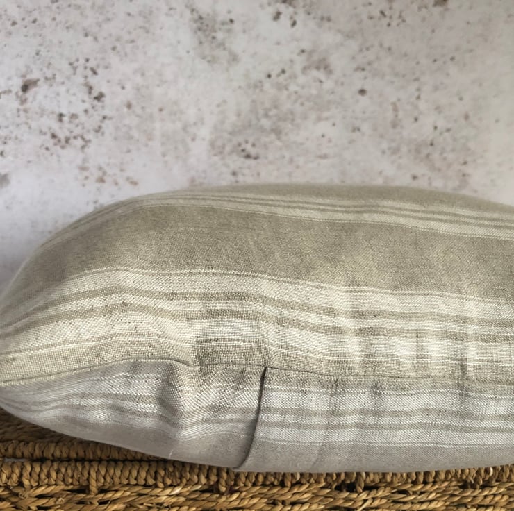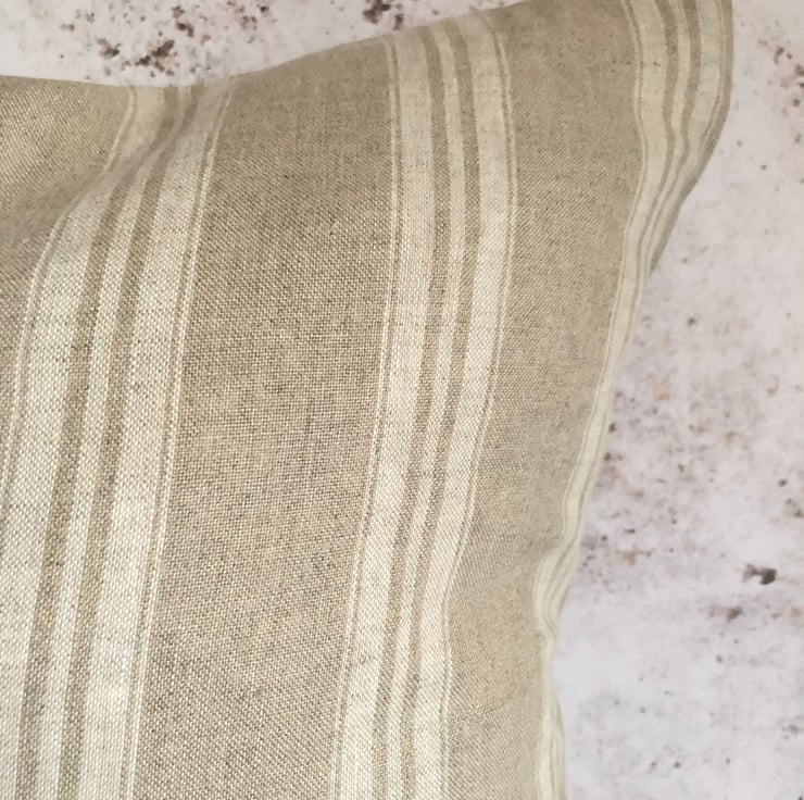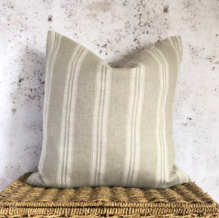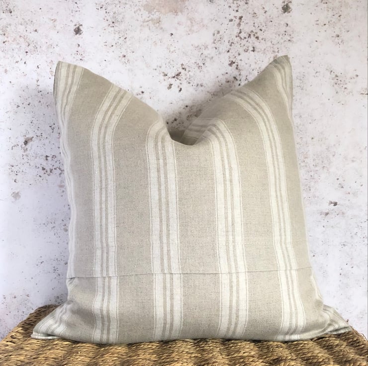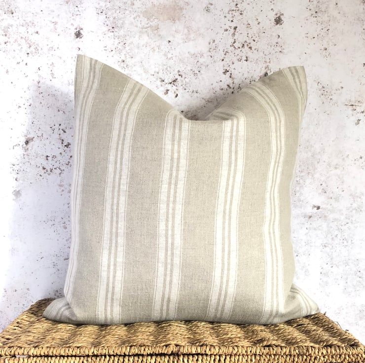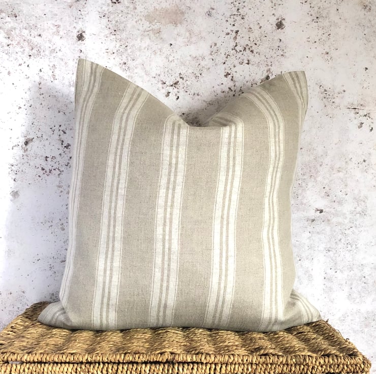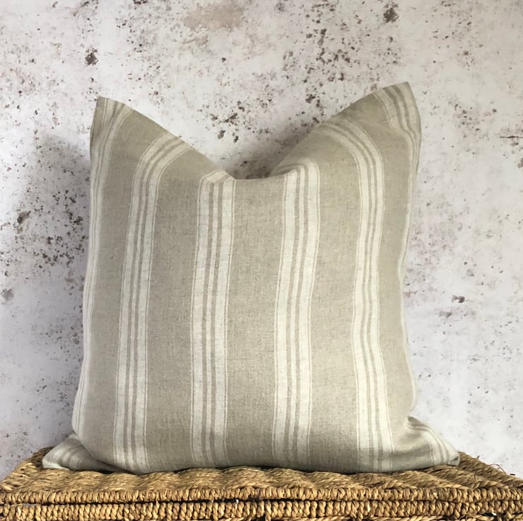 Beige washed French linen cushion cover with white stripes. Made to fit an 18” x 18” (46cm x 46cm) cushion inner which is not included.