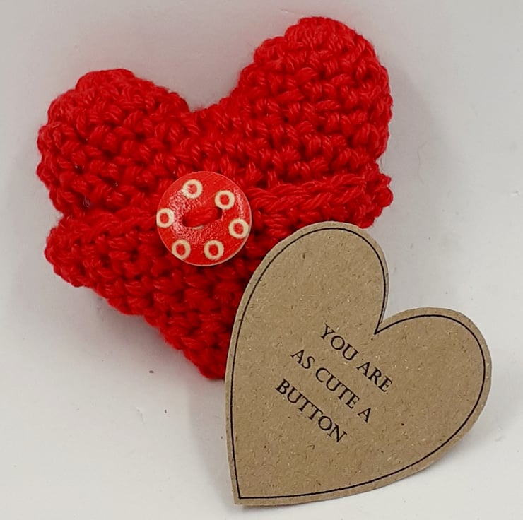 The heart is crocheted in cotton and filled with polyester stuffing. There is a small pocket either side. The front pocket is decorated with a wooden button ( non functioning) and already contains a heart-shaped card with the words 'You're as cute as a button ' although I am very happy to exchange this card for one with wording of your choice.