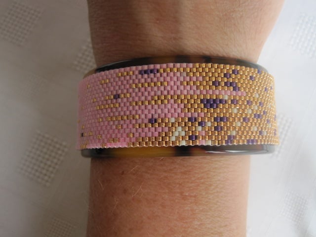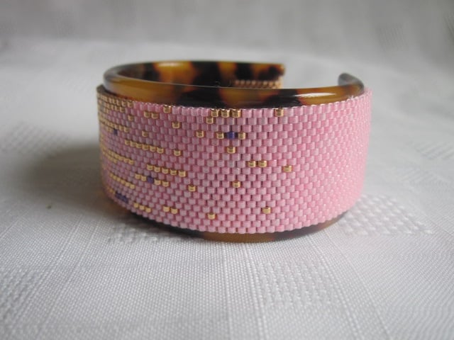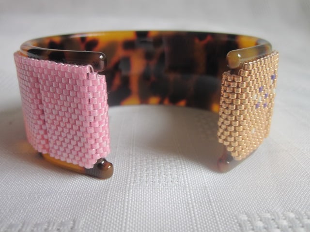 This cuff bangle is primarily pink and gold in colour with a few cream and purple splashes mixed in. The beads that were used were Japanese Delica beads. The cuff itself is wrapped round and sewn into an acrylic tortiose shell print bangle. The inside diameter of the bangle is approx. 6.2cm at it's widest point and approx 5.1cm at it's narrowest point. It's nice and light weight, weighing in at around 32g.