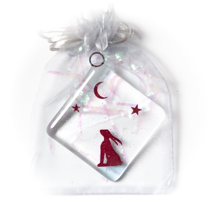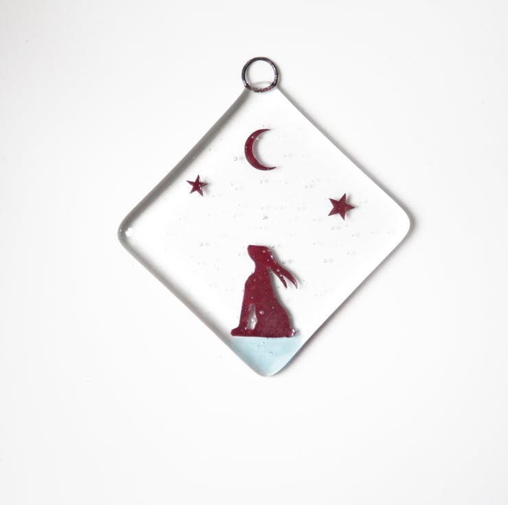 Little Hare looking at the moon in this lovely little fused glass hanging. Looks great on a wall or can be hung in a window for the sun to shine through and cast pretty shadows