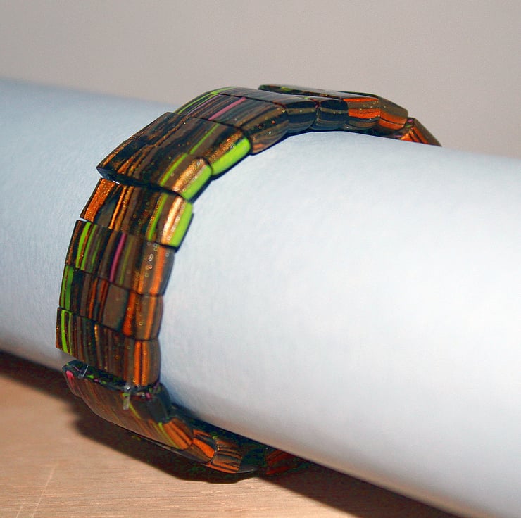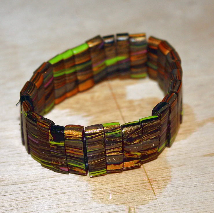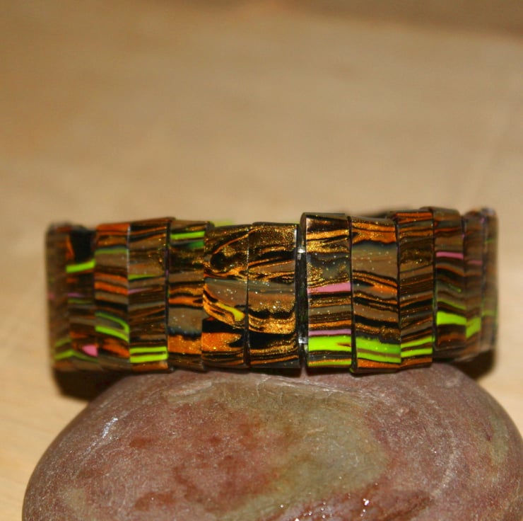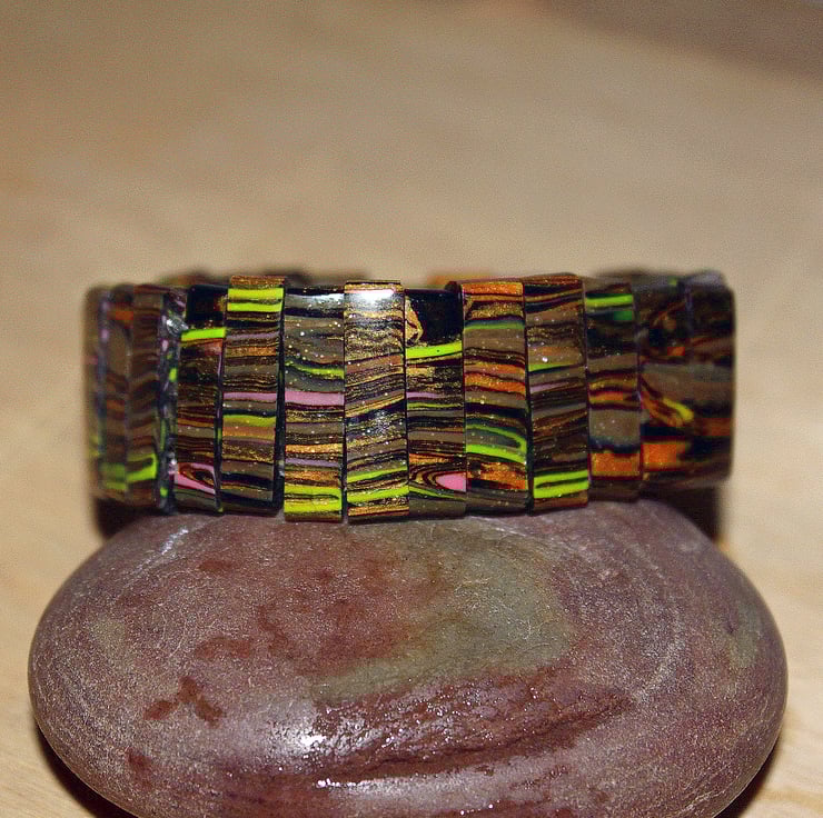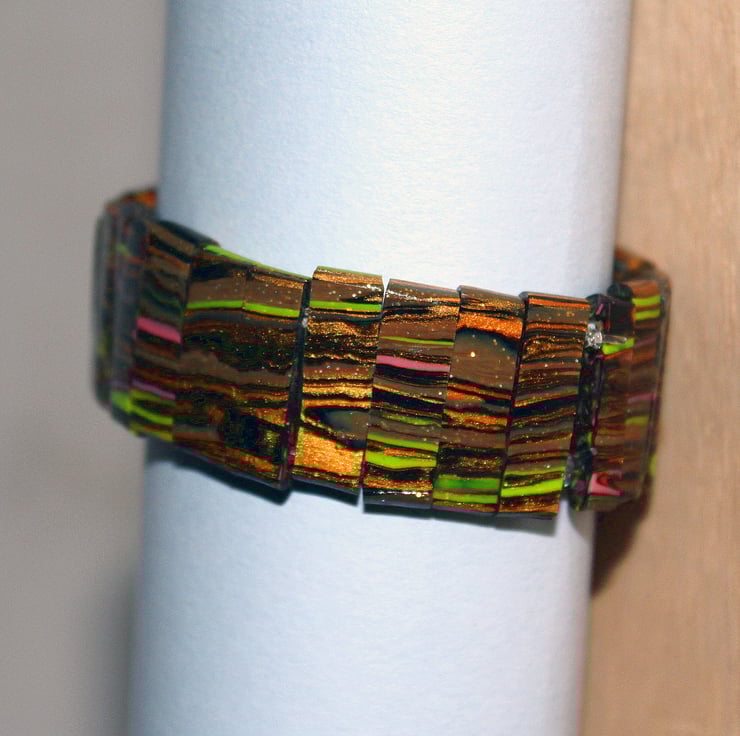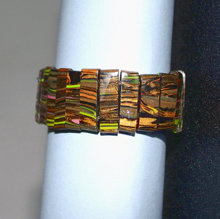 A captivating swirl of golden onyx marble style tiles - as though from some far off mine, yet to be discovered - are linked together for this lovely bracelet. The tiles are hand crafted, by myself, from polymer clay and linked together on two threads of unbreakable stretchy elastic - the bracelet is lightweight, smooth and comfortable to wear.It is 22mm wide,(nearly 1") and 5mm thick