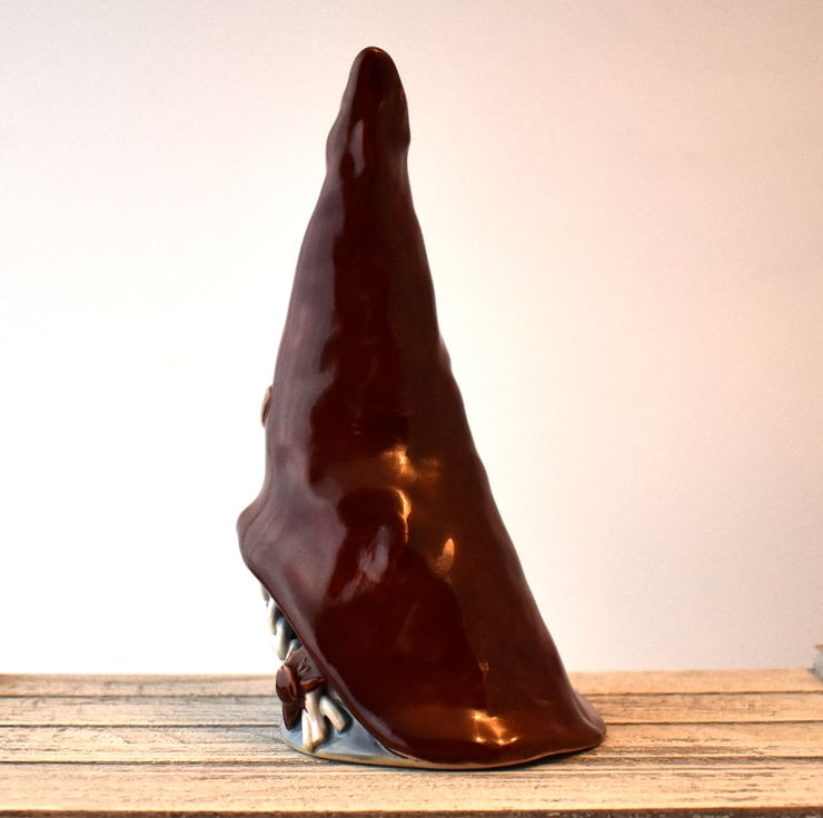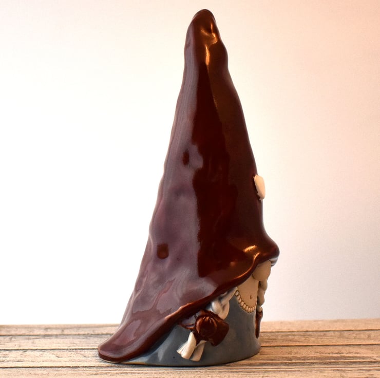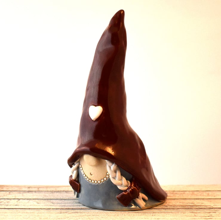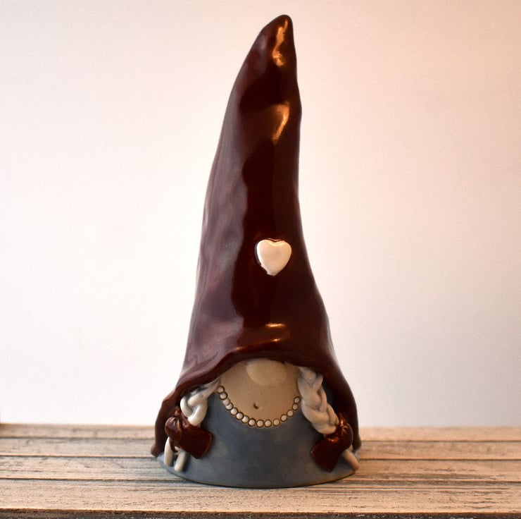 A Scandinavian nisse or tomtenisse gnome of the female persuasion, standing 19cm tall. This little lassie will be equally happy sitting on your shelf, under your Christmas tree, or even out in the garden in the summer.