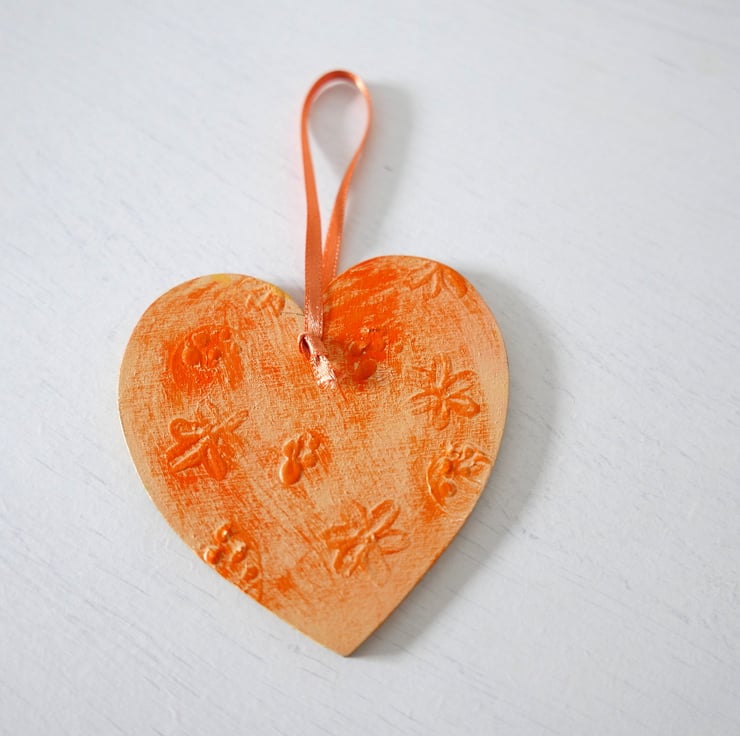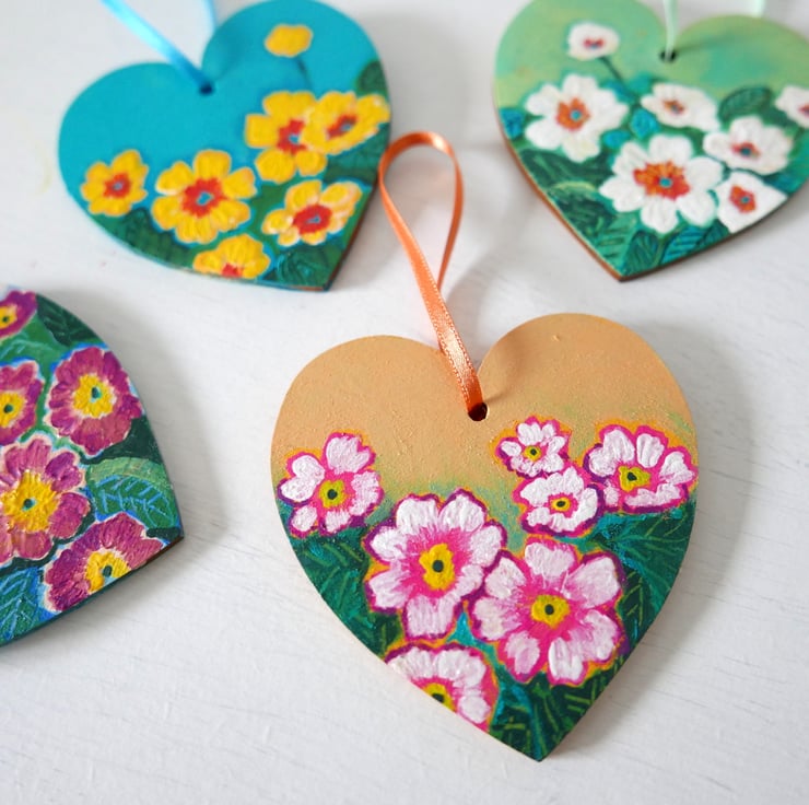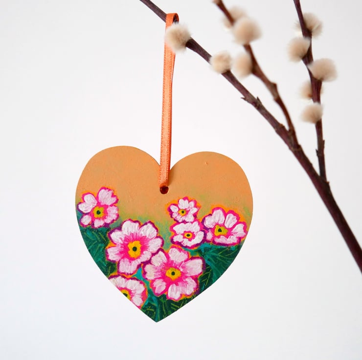 This hanging heart is hand-painted by me with acrylic paint on plywood and it is varnished for protection with gloss varnish. It features pink primrose flowers against a green and yellow background. The heart finished with a light orange ribbon for hanging. The last two photos show a collection of spring flowers heart available so if you wish to acquire more, you can mix and match the design to your taste.