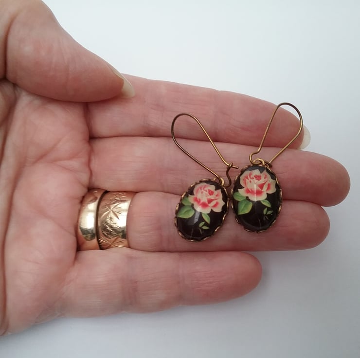 .Vintage dainty floral cabochon earrings set into brass scallop edge settings