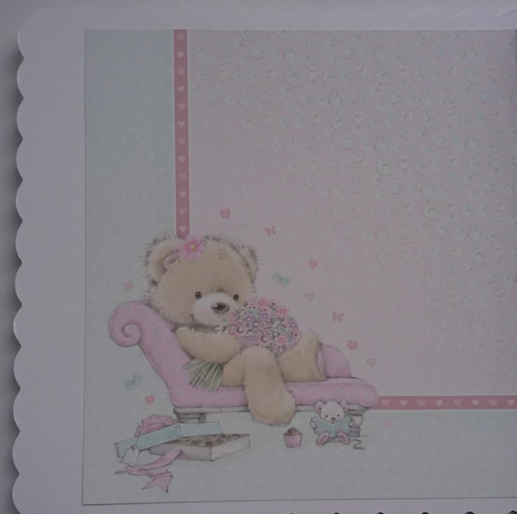 The design is a very cute teddy bear sitting on a pretty pink chaise lounge. She is holding a beautiful bouquet of spring flowers she has been given after opening a box of chocolates which is sitting on the floor.