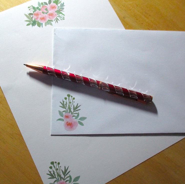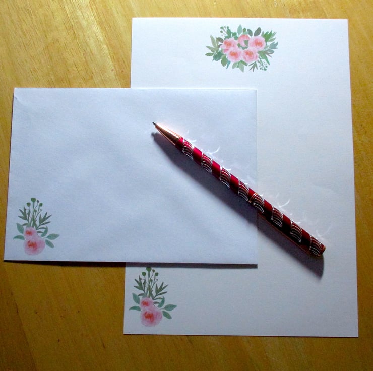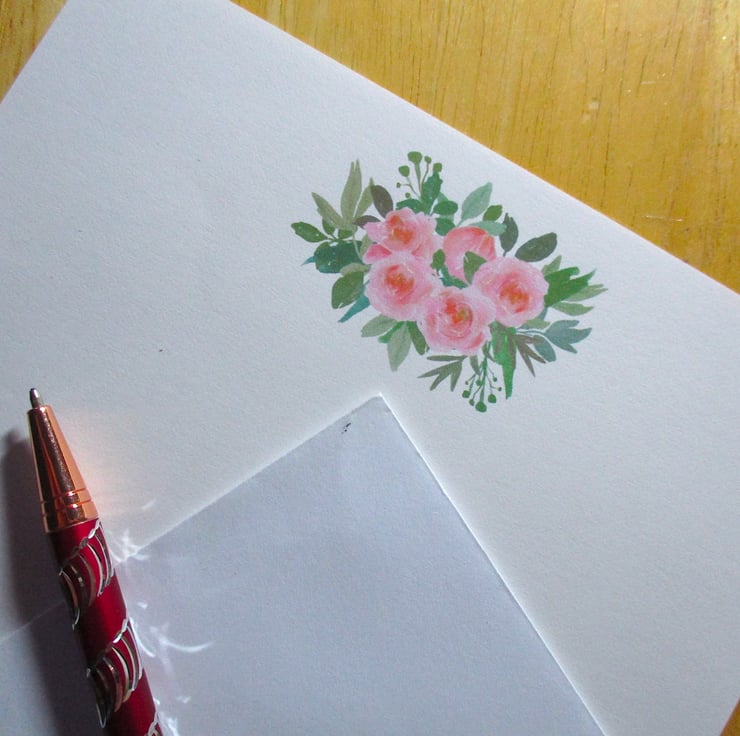 Watercolour pink roses design writing paper set of 15 pieces with optional personalisation.