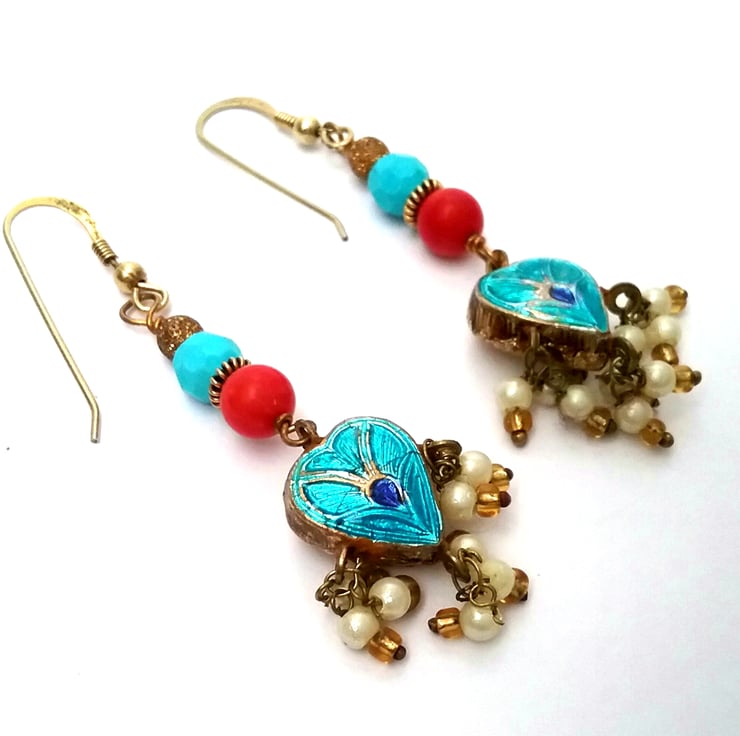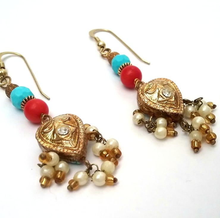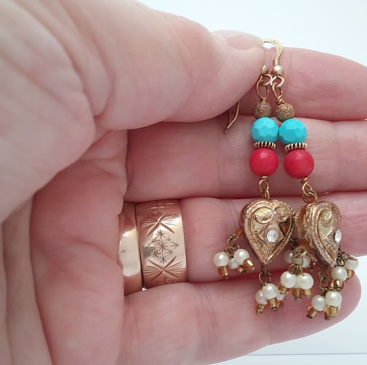 Iv used red coral bead and a turquoise bead with gold spacers and antique gold star dust bead.