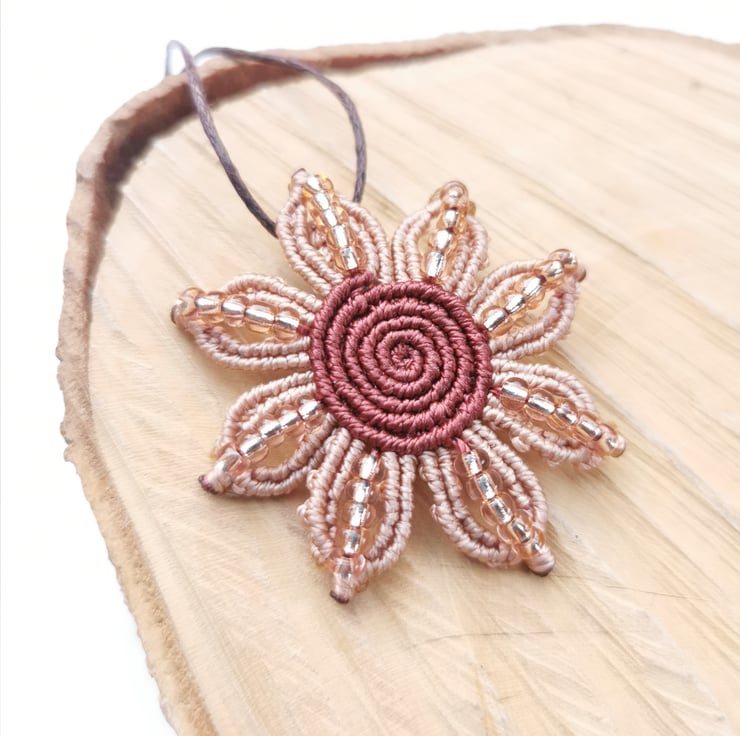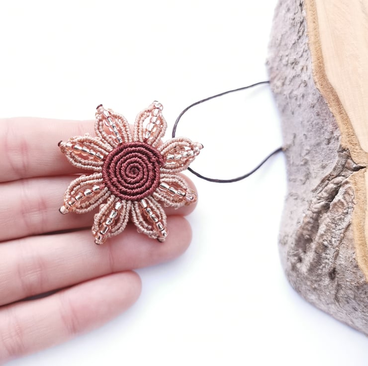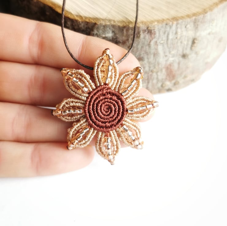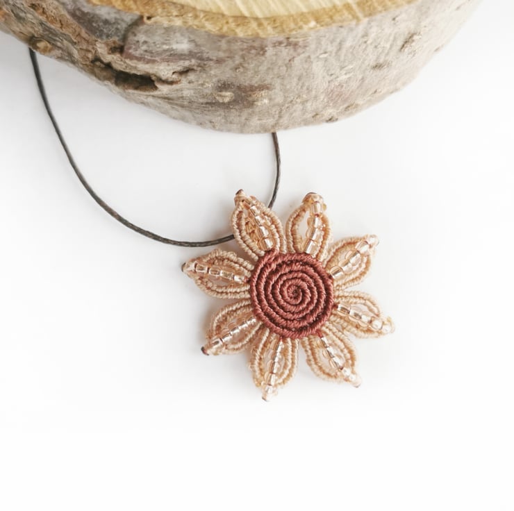 Unique micro macrame flower necklace pendant made with glass seed beads.