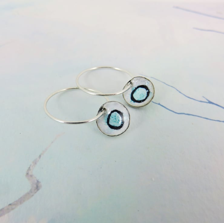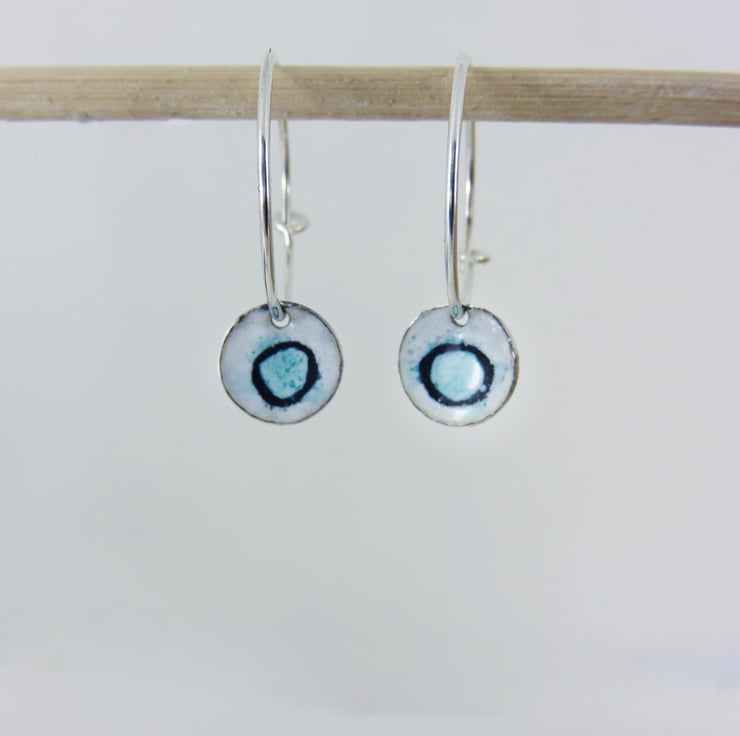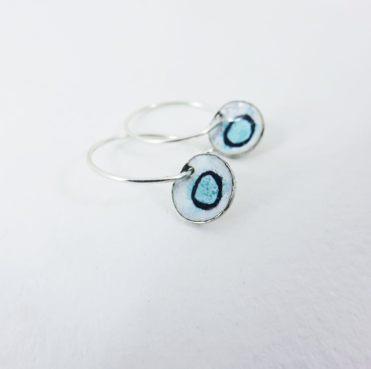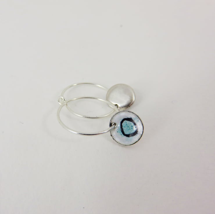 15mm silver hoops with an 8mm silver disc attached. The silver disc has a hand drawn circle in enamel. The back is shiny silver. It moves freely on the hoop. The heart has been painted with a final layer of turquoise enamel.