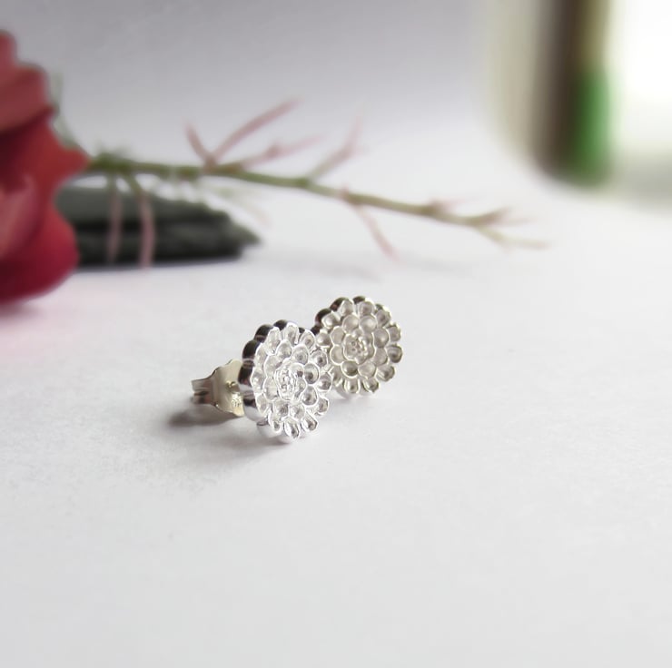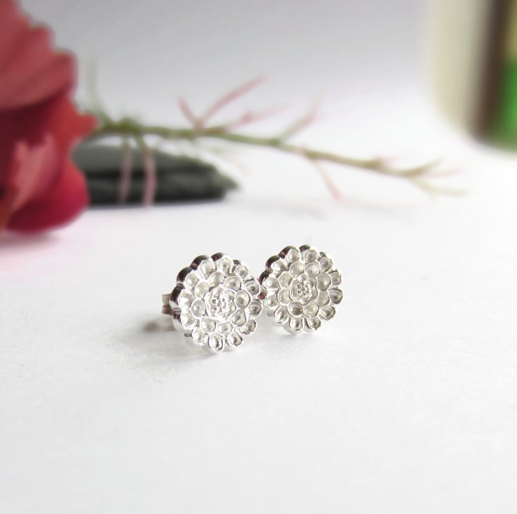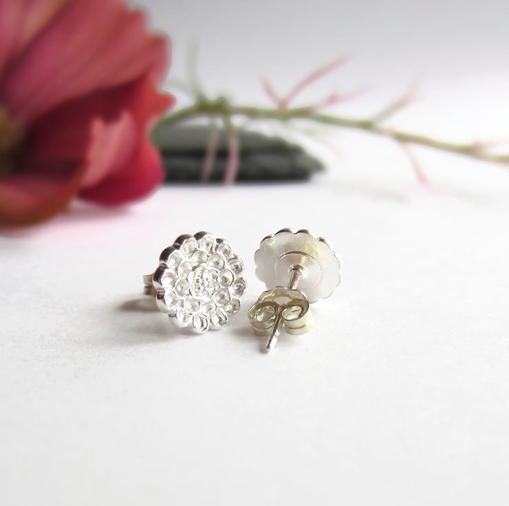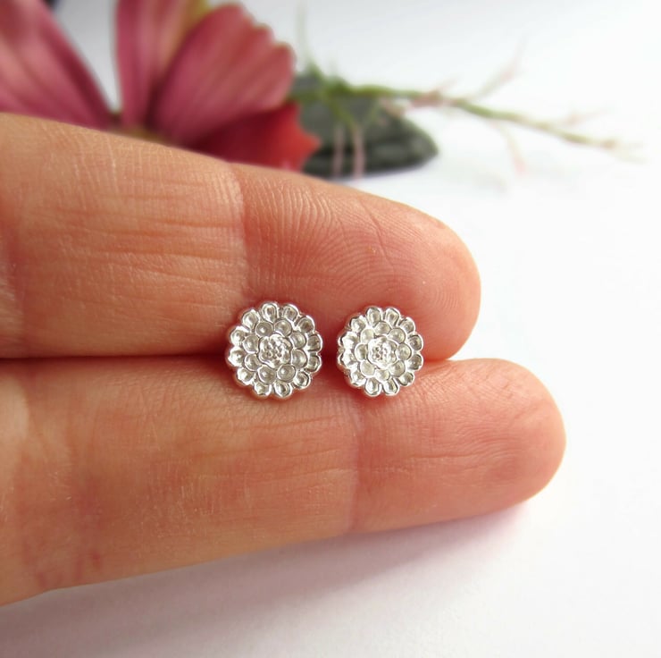 Pretty little handcrafted fine silver dahlia flower stud earrings are perfect for everyday wear to add a touch of sweet floral boho to your outfit.