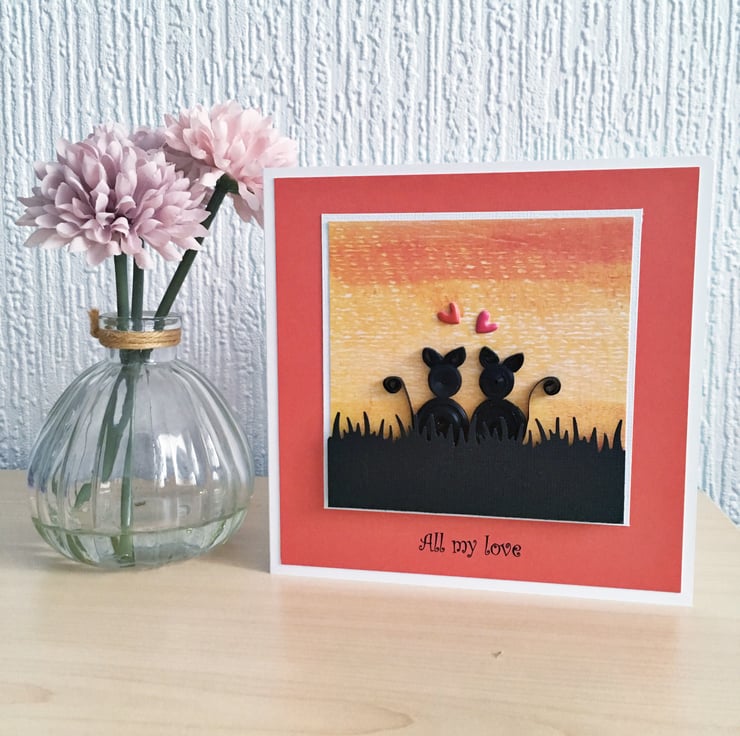 This adorable handmade card has two quilled cats watching the sun set side by side and is perfect for an anniversary, birthday or Valentine’s Day.