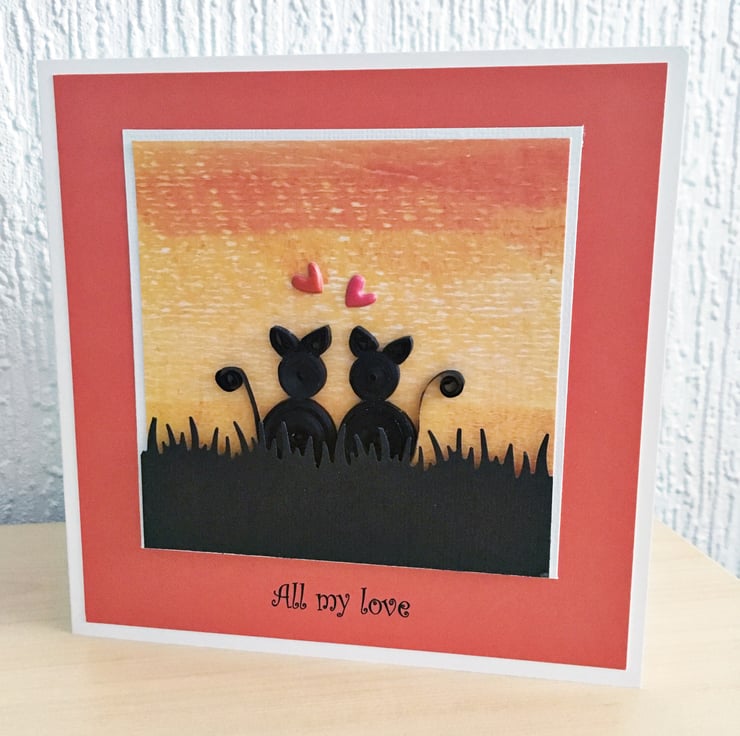 This adorable handmade card has two quilled cats watching the sun set side by side and is perfect for an anniversary, birthday or Valentine’s Day.