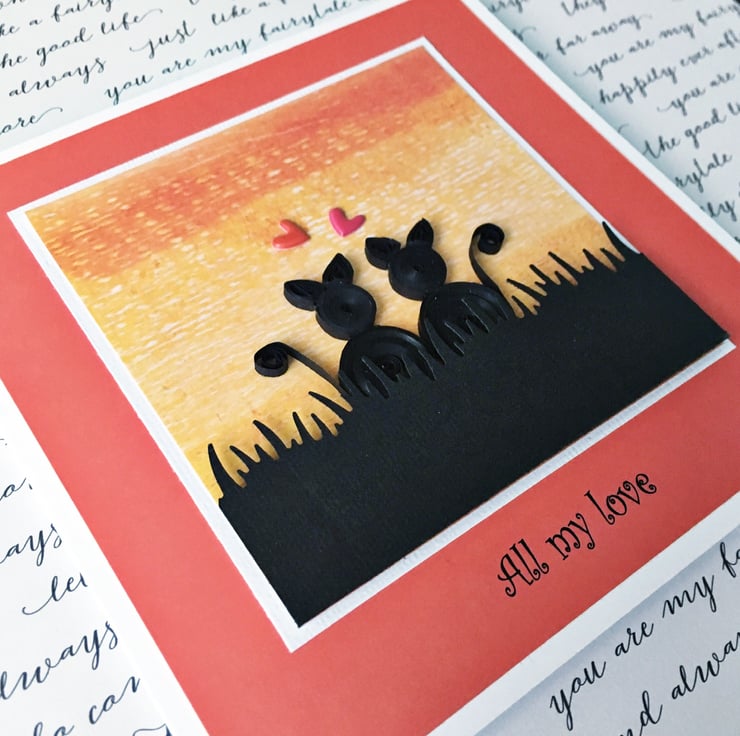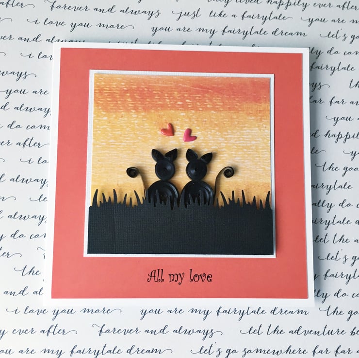 This adorable handmade card has two quilled cats watching the sun set side by side and is perfect for an anniversary, birthday or Valentine’s Day.