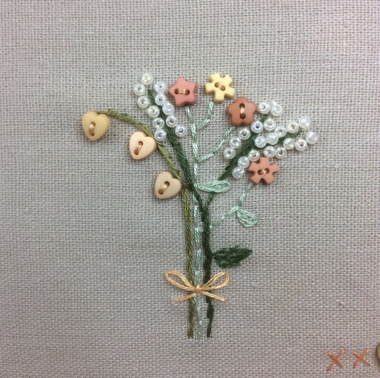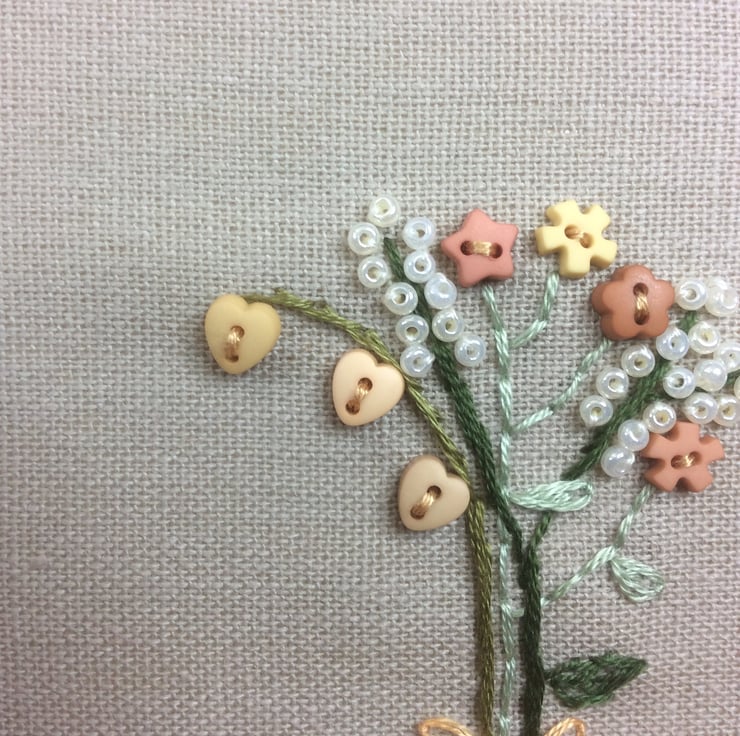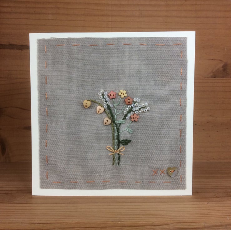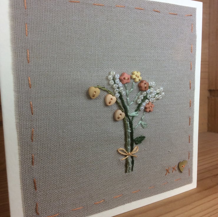 A beautifully bespoke hand stitched card, a posie of flowers made with orange and yellow shades of buttons, beads and embroidery. It is stitched onto cashel linen and backed onto cream card and measures C5 (12.5 x 12.5cm) and is left blank inside for your own wording. This card is individual, highly unique and perfect for a special occasion, it could also easily be framed to make a lasting gift. All of my cards are carefully packaged in cellophane and tissue paper and are posted within one day of purchase.