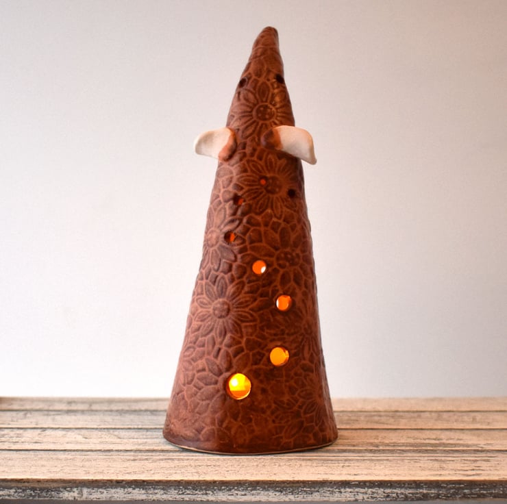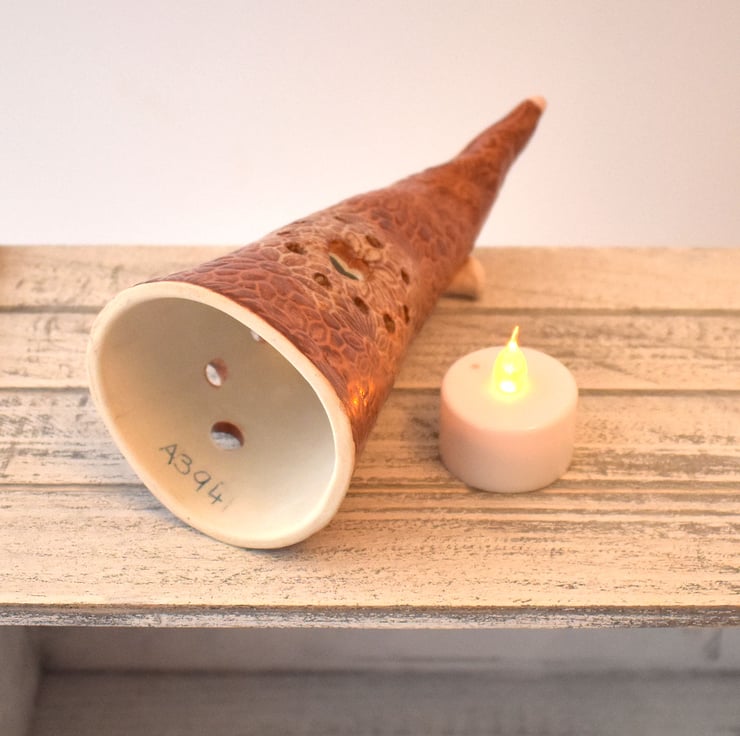 A pet rat or mouse shaped tea light cover hand built in white stoneware clay, standing approximately 17 cm tall and having a textured surface with holes to let the glow of a tealight through.