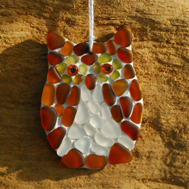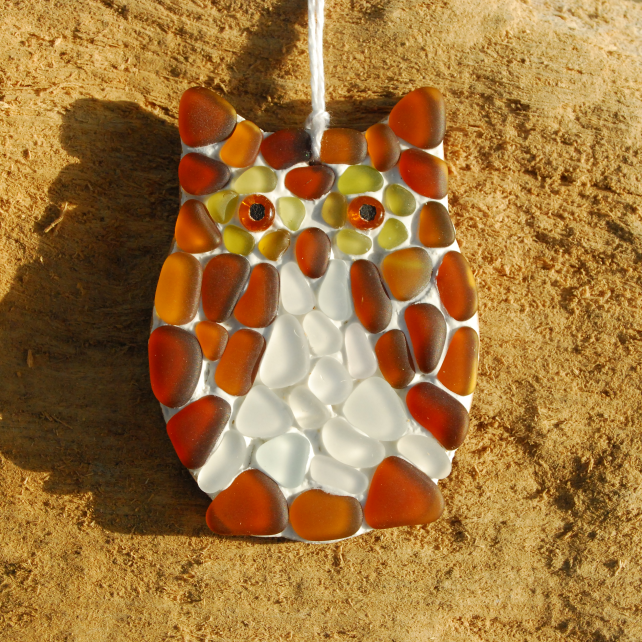 We love our little owls because they're so characterful. Each of our owls is quite different because we have so little glass of the colour around the owl's eyes. The pieces of glass are all a bit curved as they have come from a variety of old broken bottles, and we have tumbled them so they are smooth and finely frosted. The back of the hanger is top quality laser cut plywood which has an attractive brown edge.