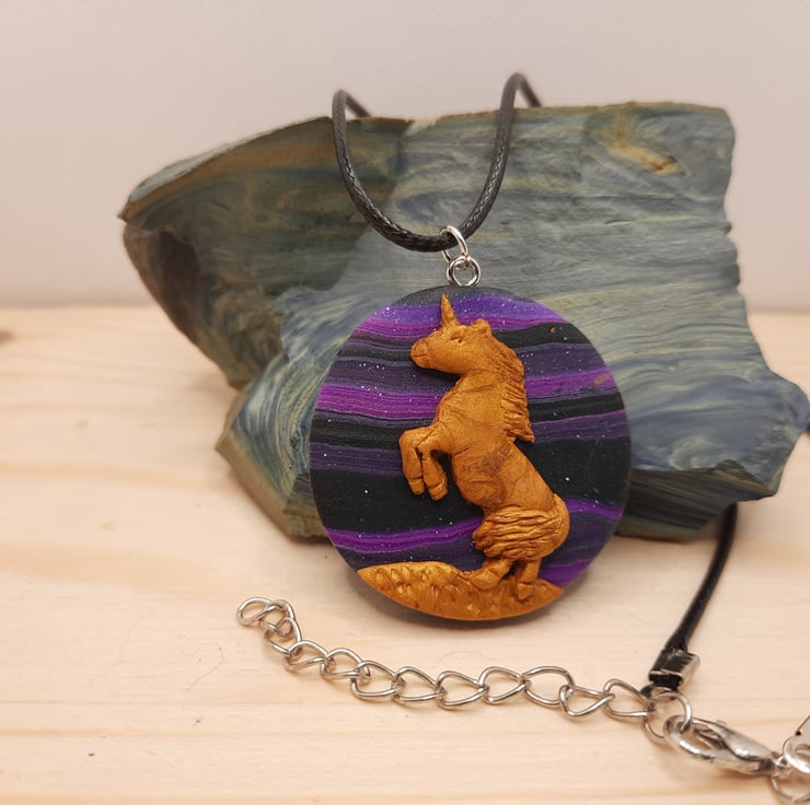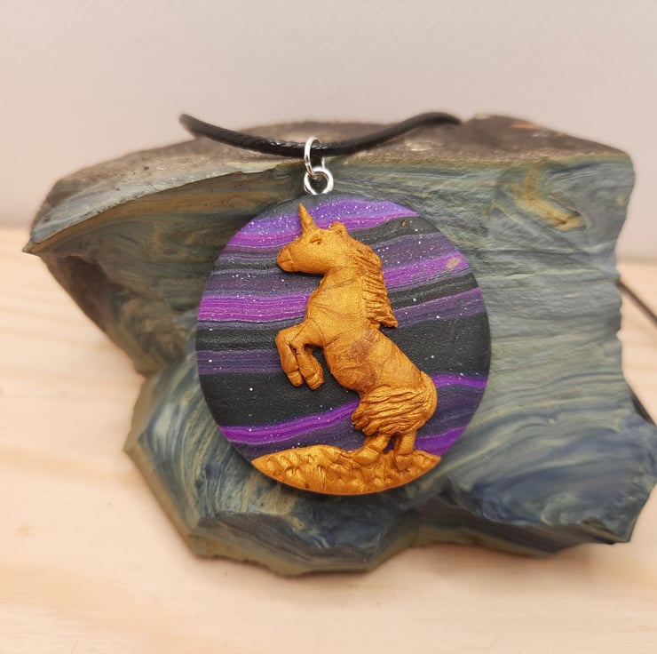 Circular disc pendant 3.5cm with black background with marbled swirls of purple and glitter. On top is placed a gold hand made fimo unicorn. The whole pendant is 0.5cm thick.