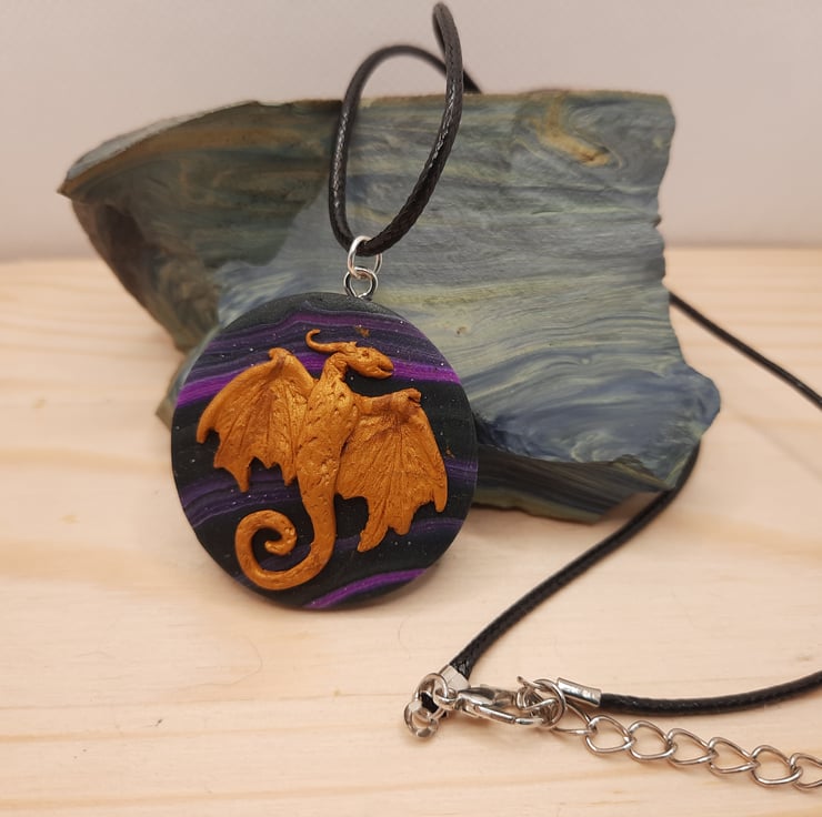 Circular disc pendant 3.5cm with black background with marbled swirls of purple and glitter. On top is placed a gold hand made fimo dragon. The whole pendant is 0.5cm thick.
