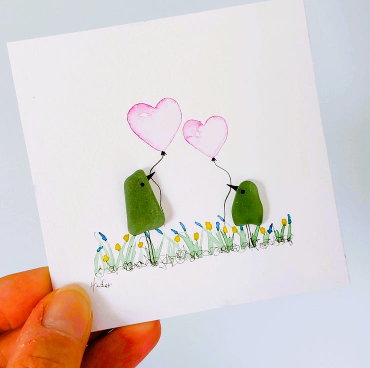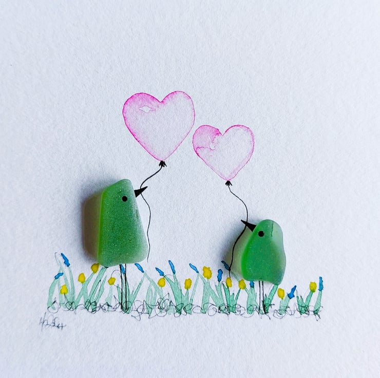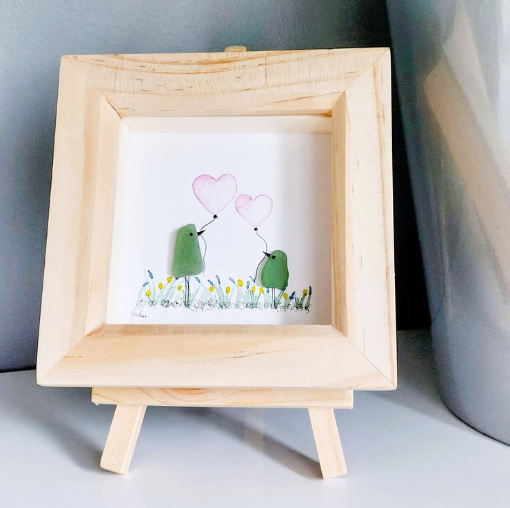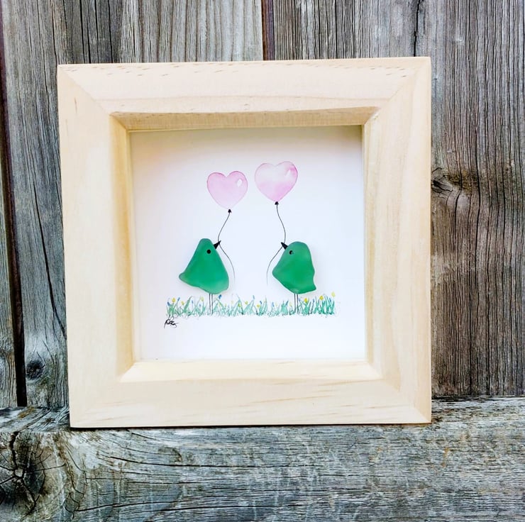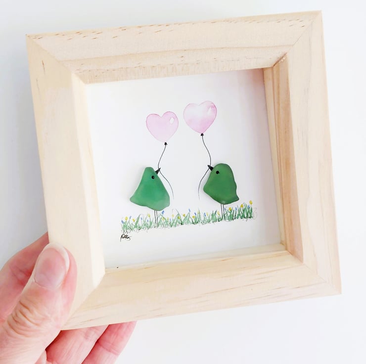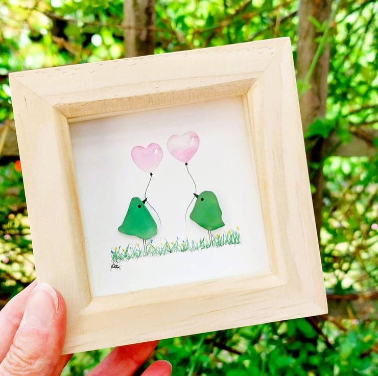 An adorable sea glass bird picture crafted from naturally tumbled beachcombed pieces of sea glass, with hand painted watercolour balloons, this gorgeous piece of original mini artwork will always bring a smile to someone's face and makes a perfect little gift for a variety of occasions.