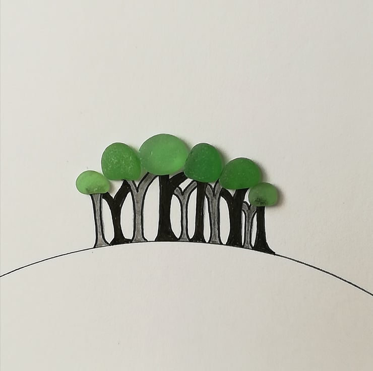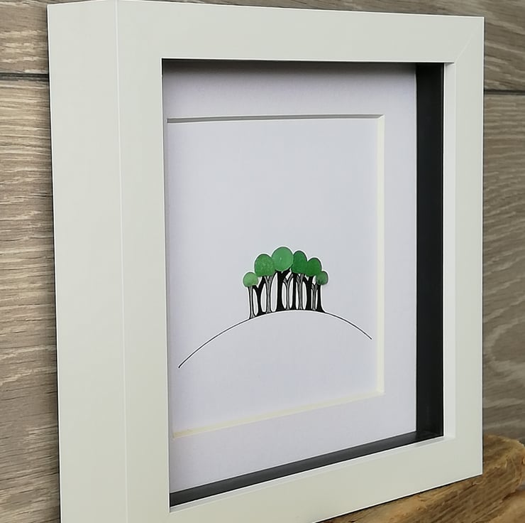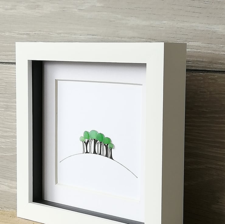 Some people might call them 'nearly there trees' some say 'coming home trees'. I have made them out of different shades of green seaglass. Mounted them into a lovely white frame. The frame measures 7in x 7in.