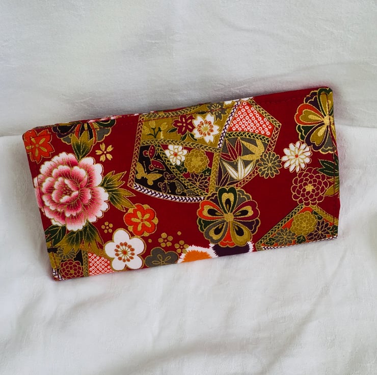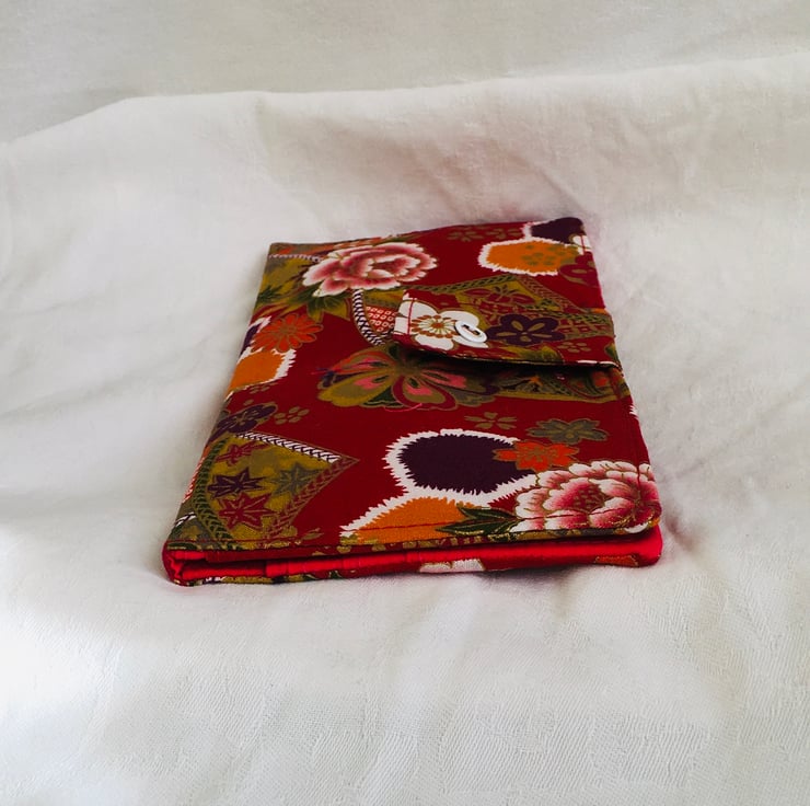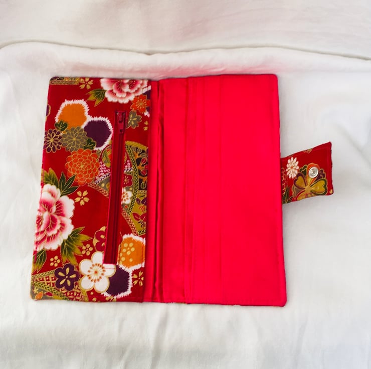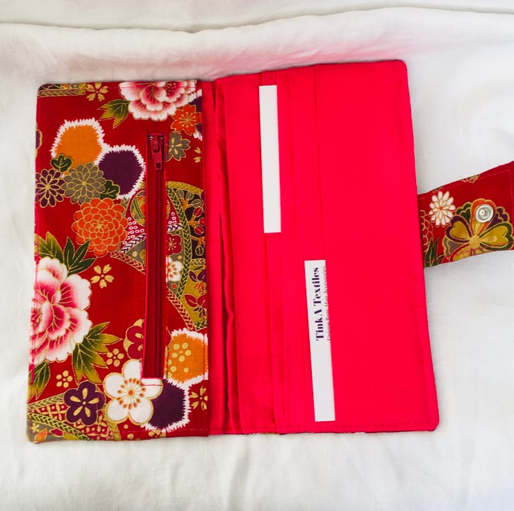 The purse has been made using a dense weave cotton for the outer in an Oriental print, this also used for the internal zip compartment. Lining is in a plain cotton fabric and finished with a snap popper closure. Fabrics have been backed with stabilizer, to keep the purse structure and stability. The purse has 6 pockets for cards, 3 larger pockets for notes, your phone and more and 1 zip pocket for coins.