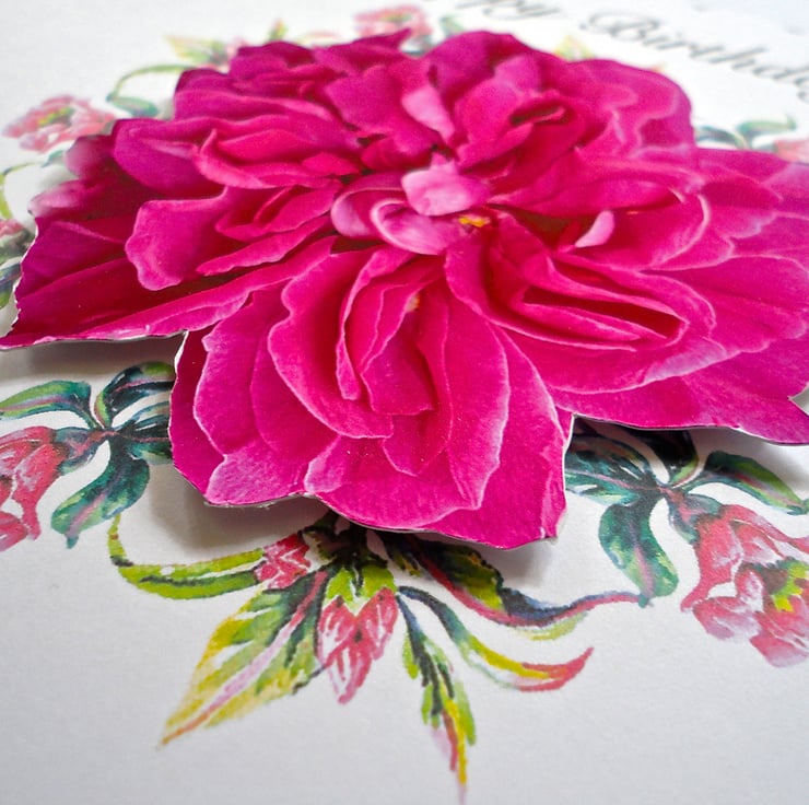 This velvet like rose is hand-cut and mounted in relief and placed centrally in an outer circle of hand painted buds and leaves; it is finished with a few pink glass gems added for sparkle.