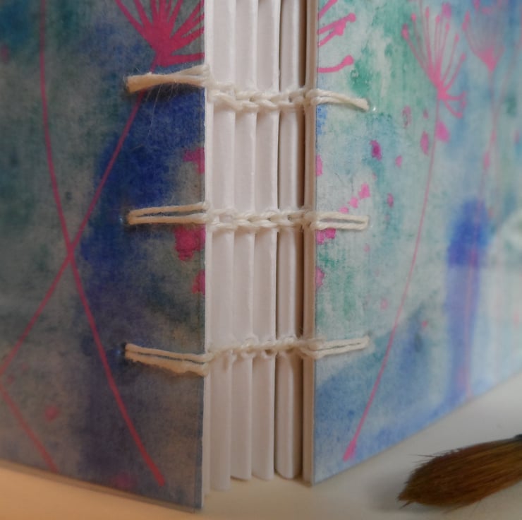 This is a handstitched book which I have bound using Coptic stitch and white waxed linen thread. This style of binding (Coptic) allows the pages to open completely flat.