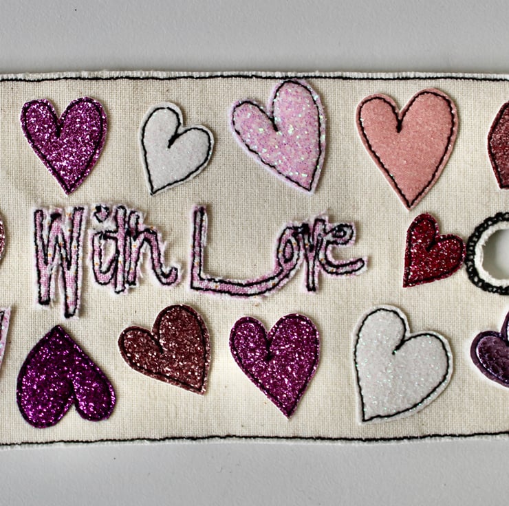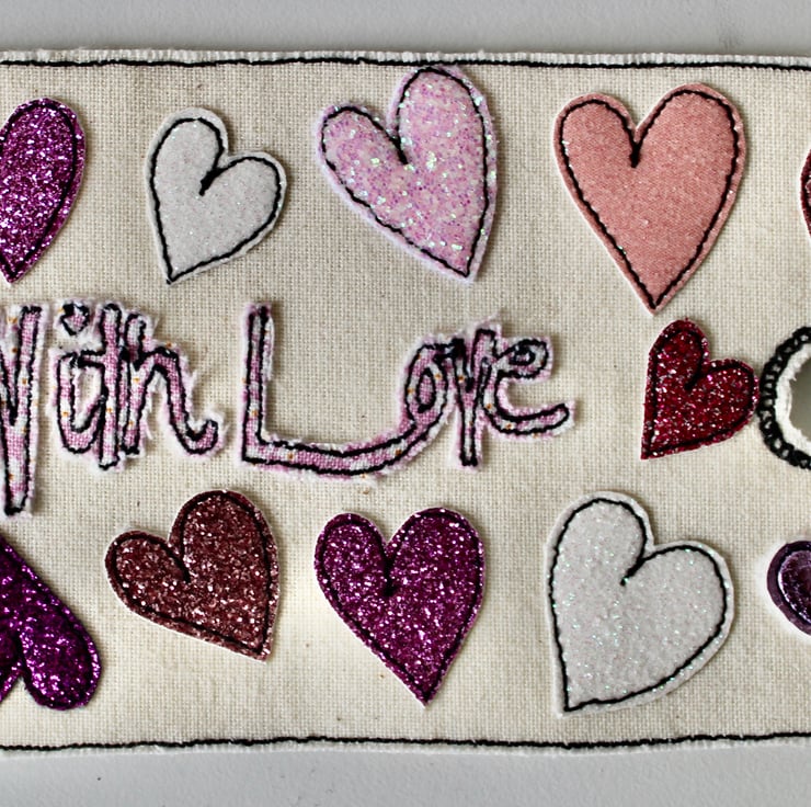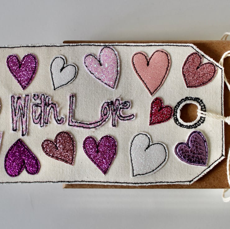 'With love' gift tag is sewn using cotton cloth, glitter cloth and free hand machine embroidery; multiple layers of cloth are sewn together and cut out by hand using very sharp scissors. With a cotton string to attach.