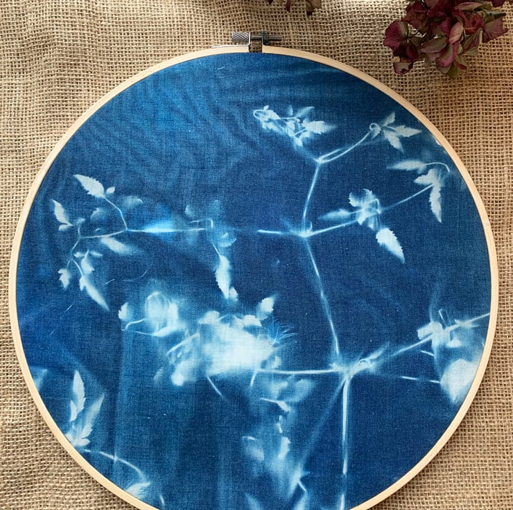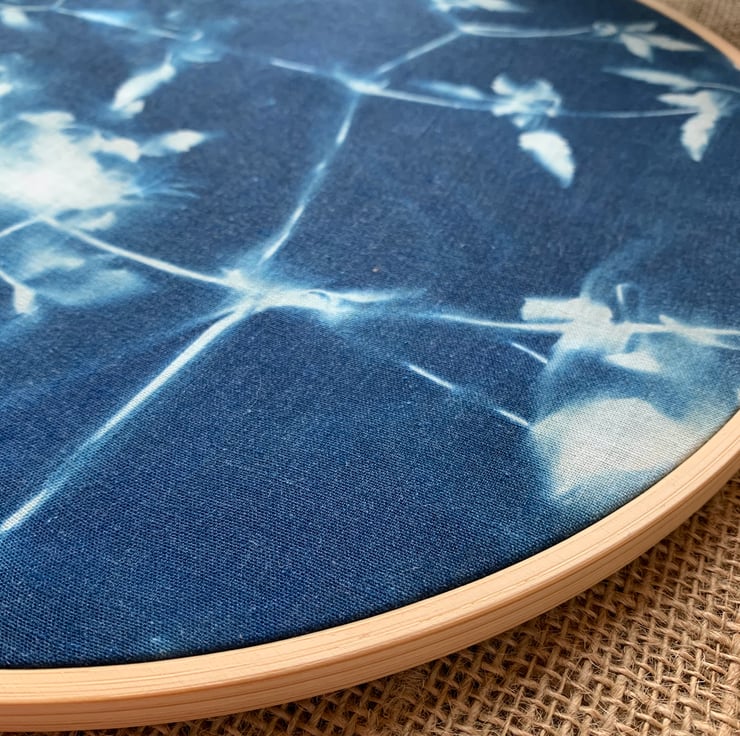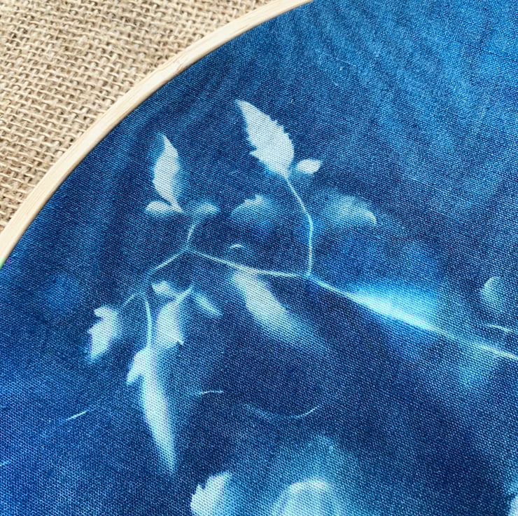 Cyanotype Process onto fabric and mounted into an embroidery hoop.