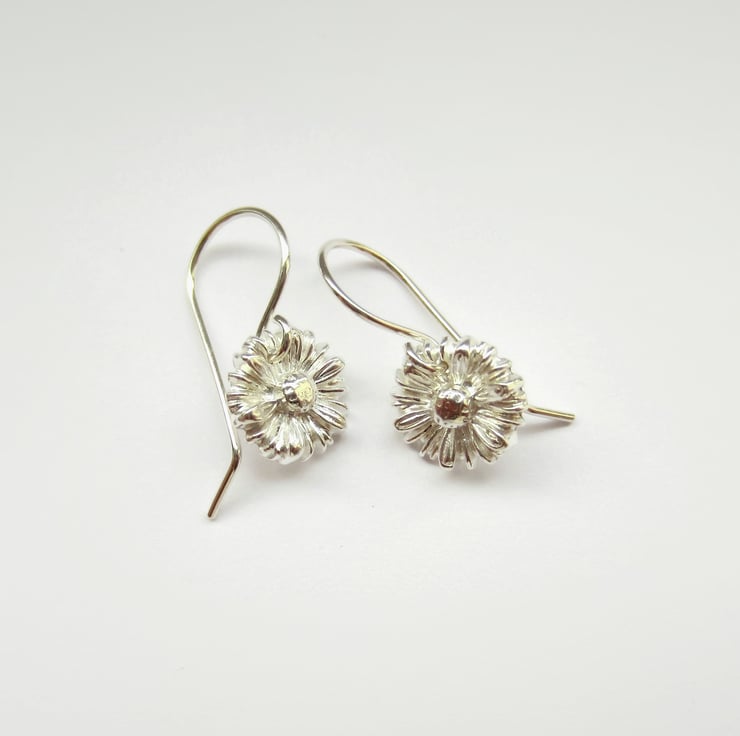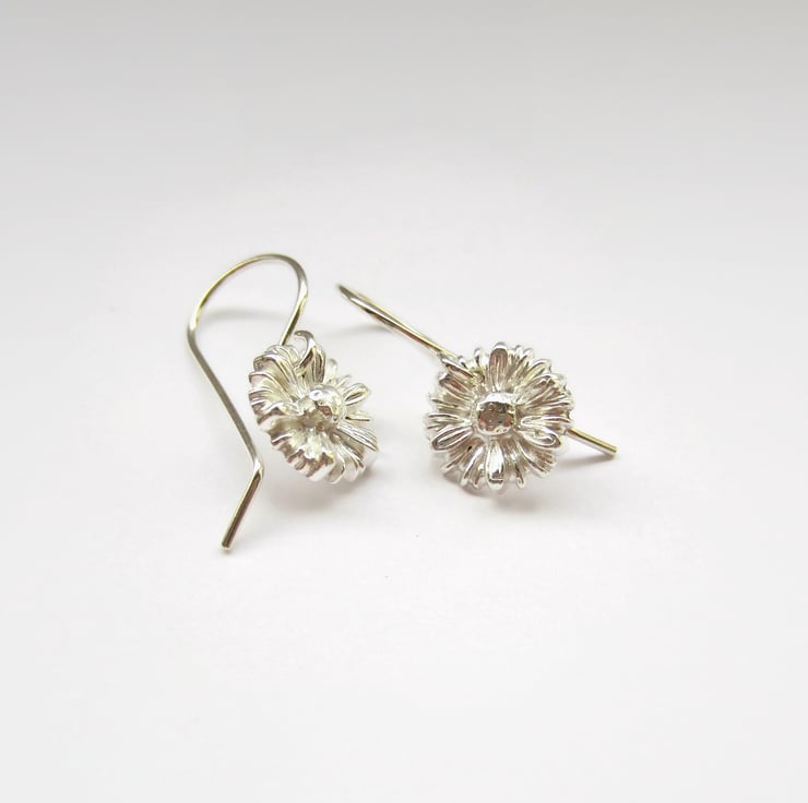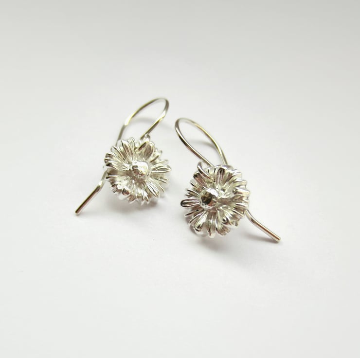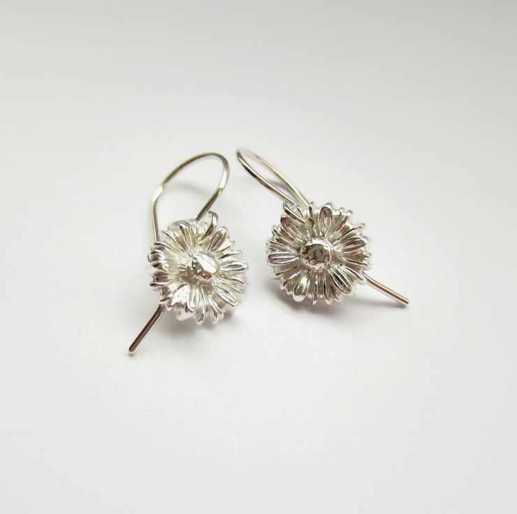 The little daisies are handcrafted by me from eco-friendly silver clay). The clay is pressed into my own handmade flower mould then dried, sanded, drilled and kiln fired, before being barrel polished in a tumble polisher. The flowers are then set on a pair of my own handcrafted sterling silver ear wires.