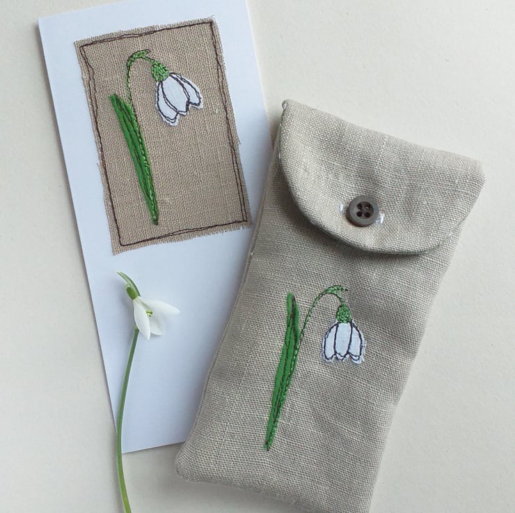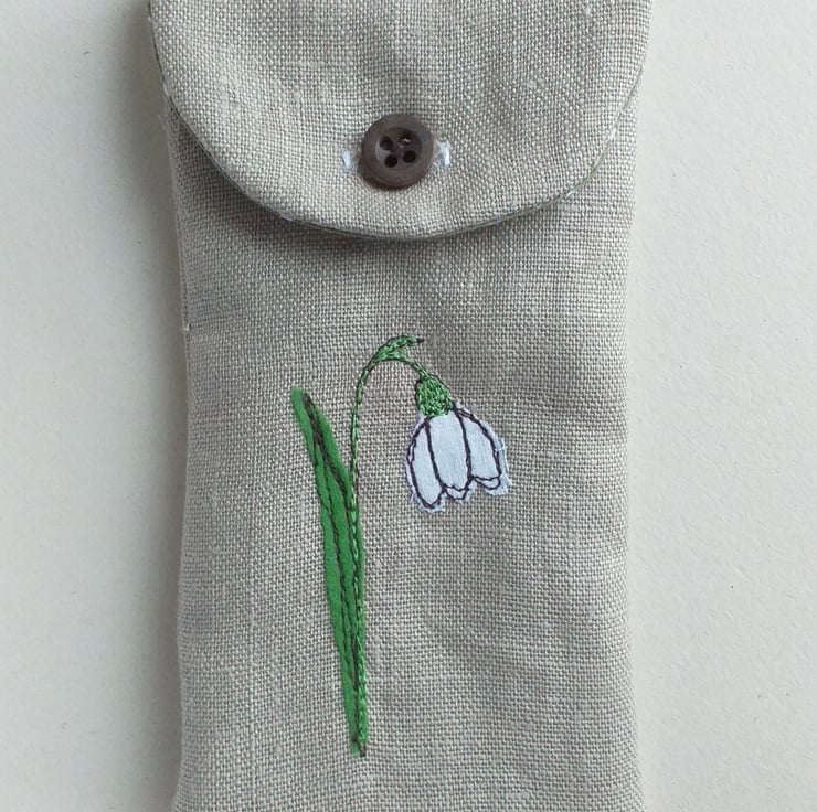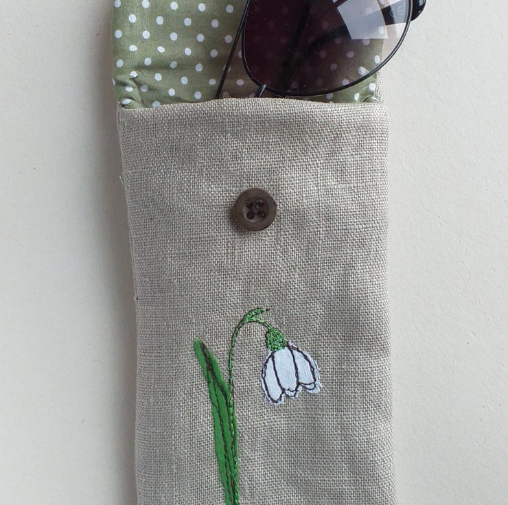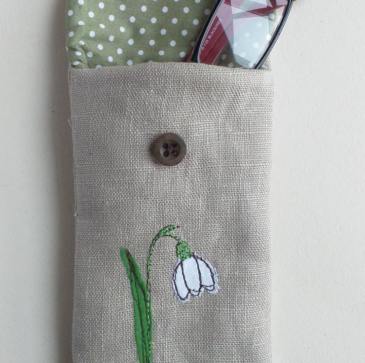 This is a soft but padded specs case, perfect for reading glasses or sunglasses. It has a snowdrop design done in freestyle machine embroidery on linen, a lovely toning spotty lining, and a button down flap. The closed case measures approximately 18cm high and 9cm wide.