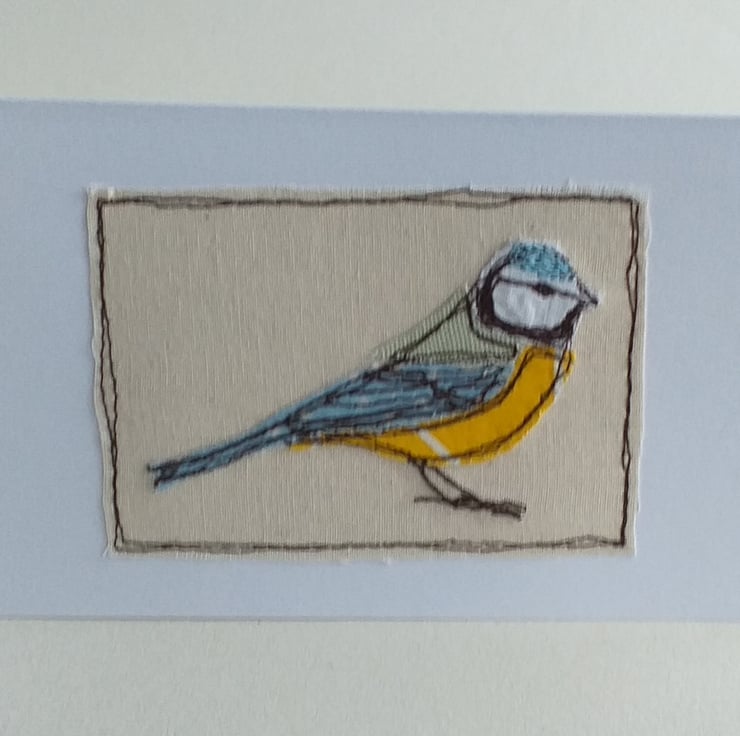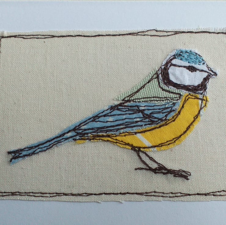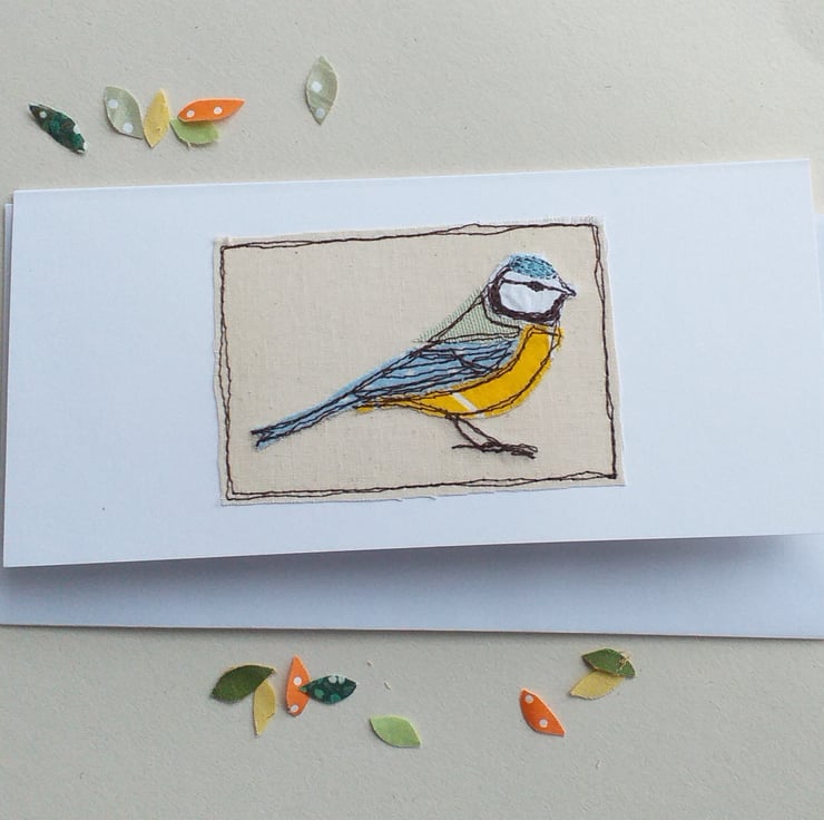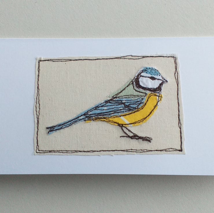 This white card has a blue-tit design made with appliqued fabric scraps hand cut and then embroidered using freestyle machine embroidery.