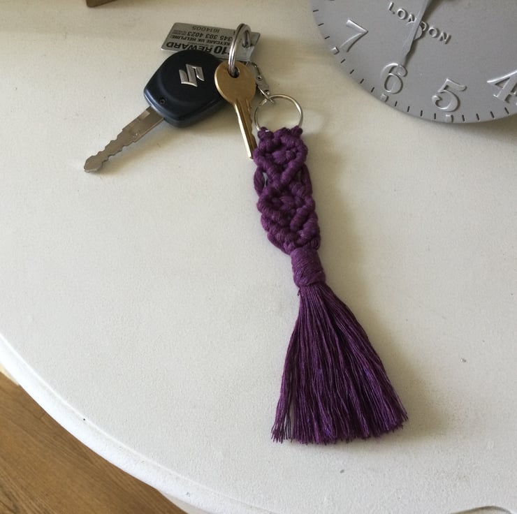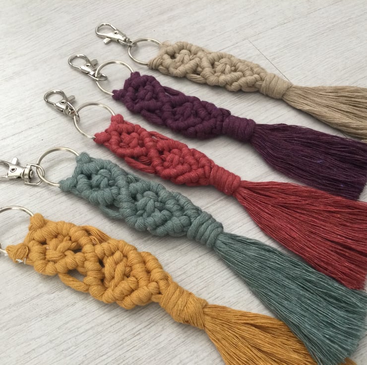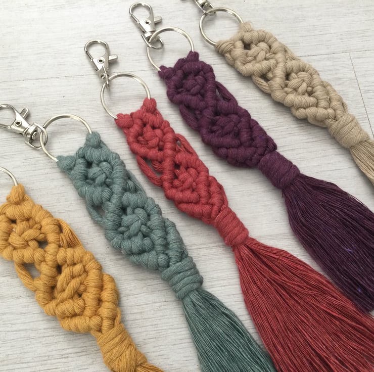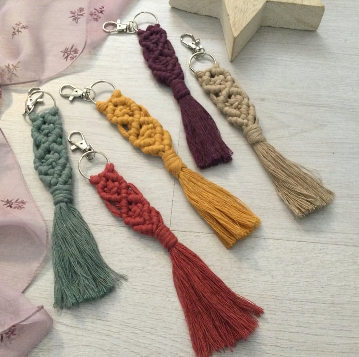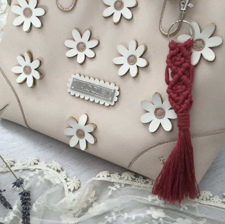 These handmade versatile macramé fringe keyring or handbag charms make a decorative and useful addition to any set of keys making them easier to find in your handbag. They also look lovely clipped with the lobster claw to a handbag or purse zip to add a unique boho touch or indeed clipped to almost anything.