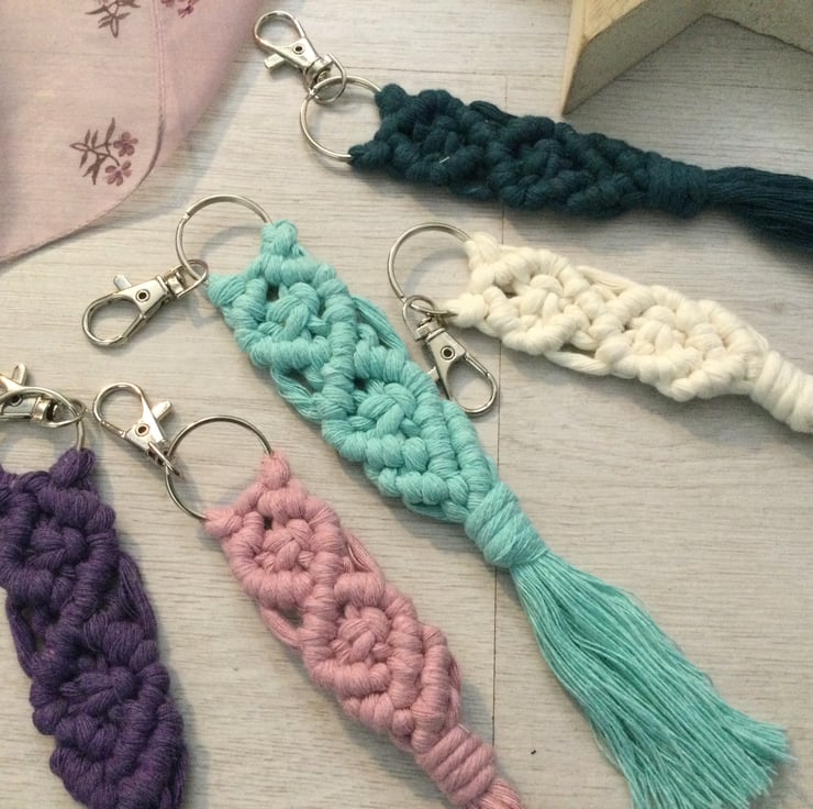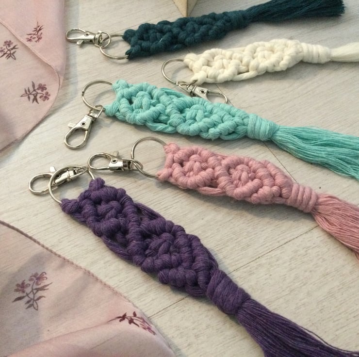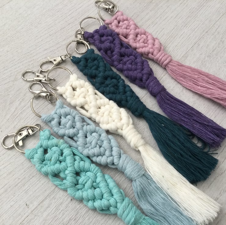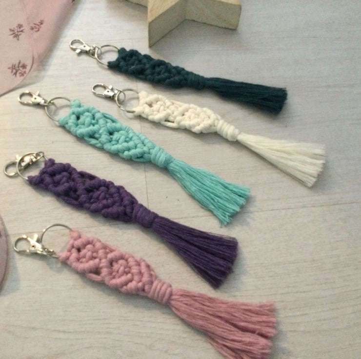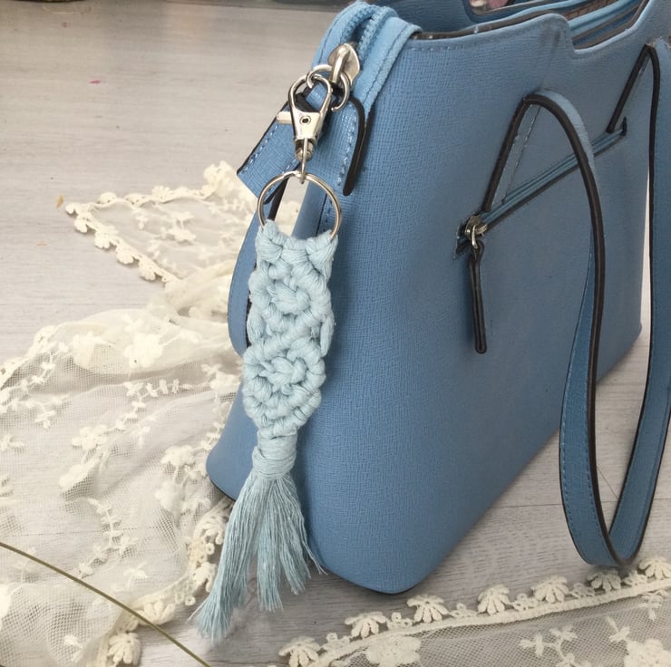 These handmade versatile macramé fringe keyring or handbag charms make a decorative and useful addition to any set of keys making them easier to find in your handbag. They also look lovely clipped with the lobster claw to a handbag or purse zip to add a unique boho touch or indeed clipped to almost anything.