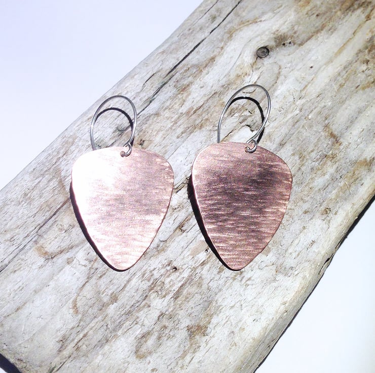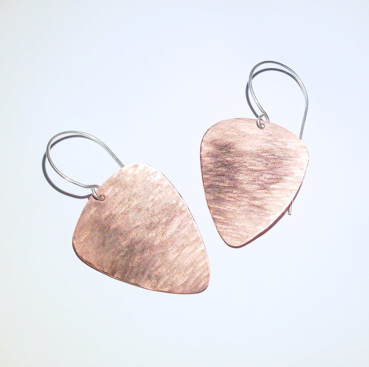 The copper 'plectrums' measure approximately 3.1 x 2.6 cm and are hung from handmade sterling silver earring wires. The perfect gift for a music lover, these earrings are decorative and are not intended for actual guitar playing.