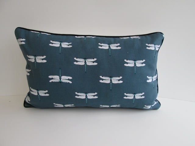 Sophie Allport dragonfly fabric cushion with cream back and central zip and black pom poms